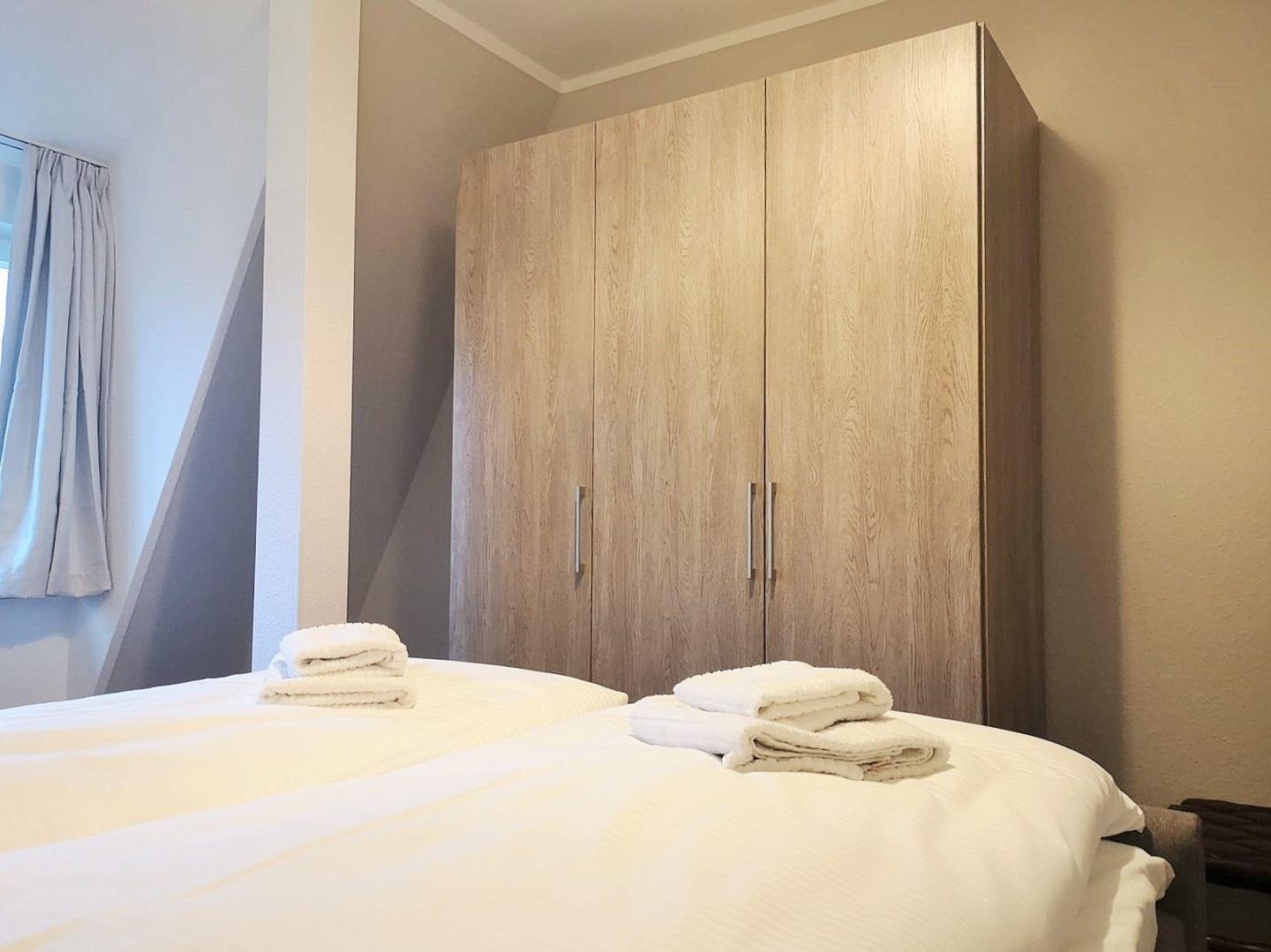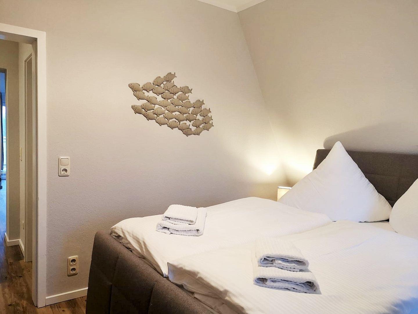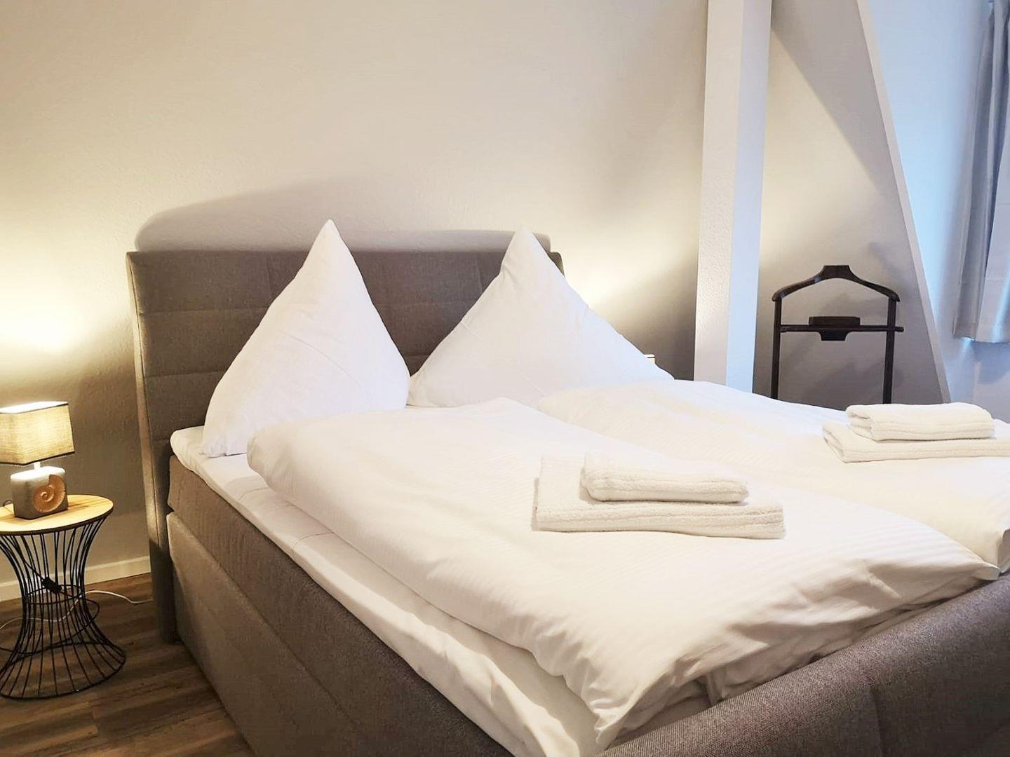 Das gemütliche Schlafzimmer ist mit einem bequemen Boxspringbett (1,60 m breit), Nachttischen sowie einem geräumigen Kleiderschrank eingerichtet.