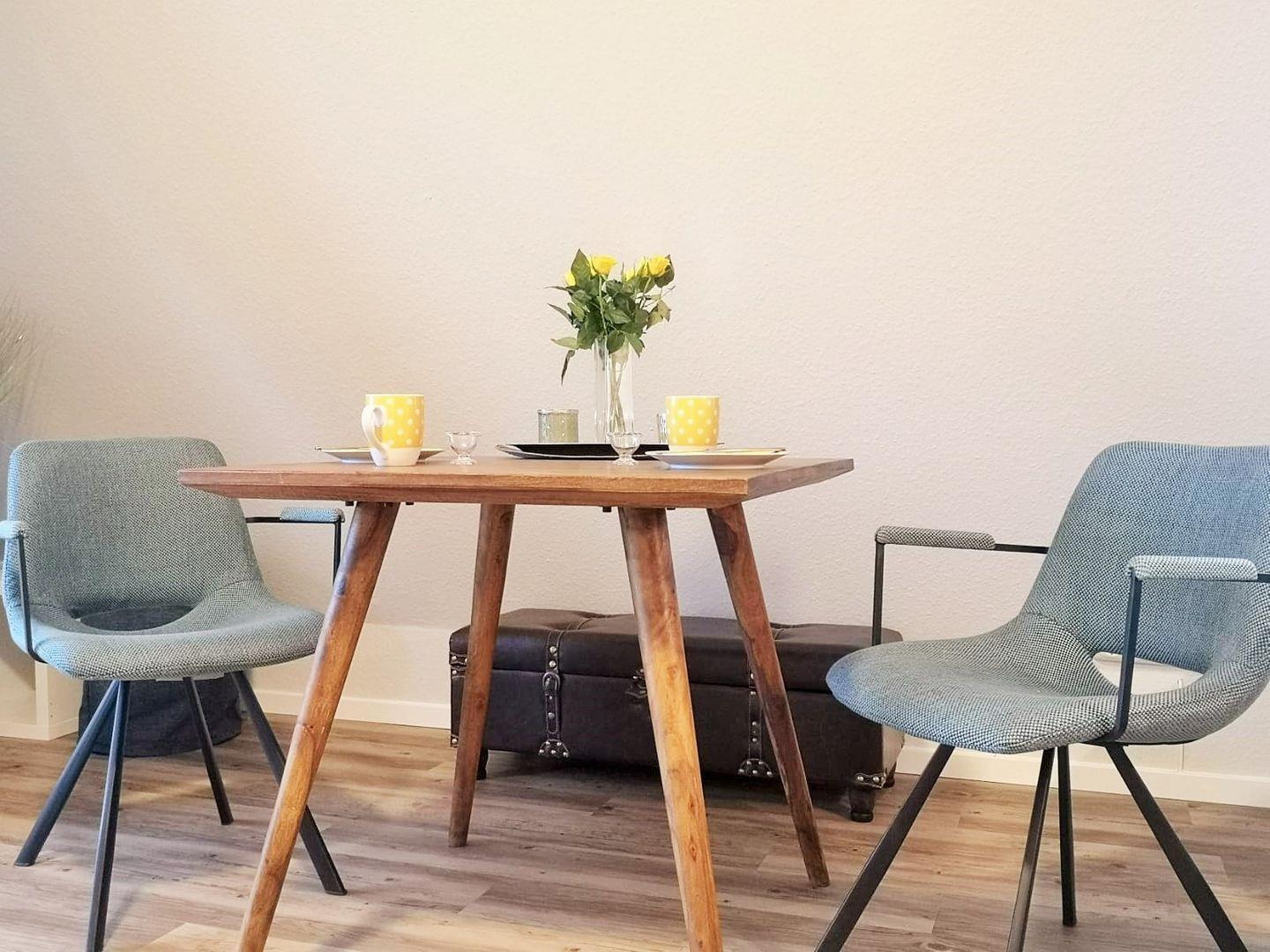 Das freundliche Wohn-/Esszimmer verfügt über eine bequeme Couch, einen separaten Esstisch mit 2 Stühlen sowie diverse kleine Tischchen und Ablagen. Vom Wohnzimmer aus haben Sie direkten Zugang zu dem ca. 8 m² großen und sonnigen Balkon (nach Westen ausgerichtet) mit Balkonmöbeln - hier sitzen Sie entspannt und gemütlich und können abends bei einem guten Glas Wein in Ruhe die lauen Sommernächte genießen!