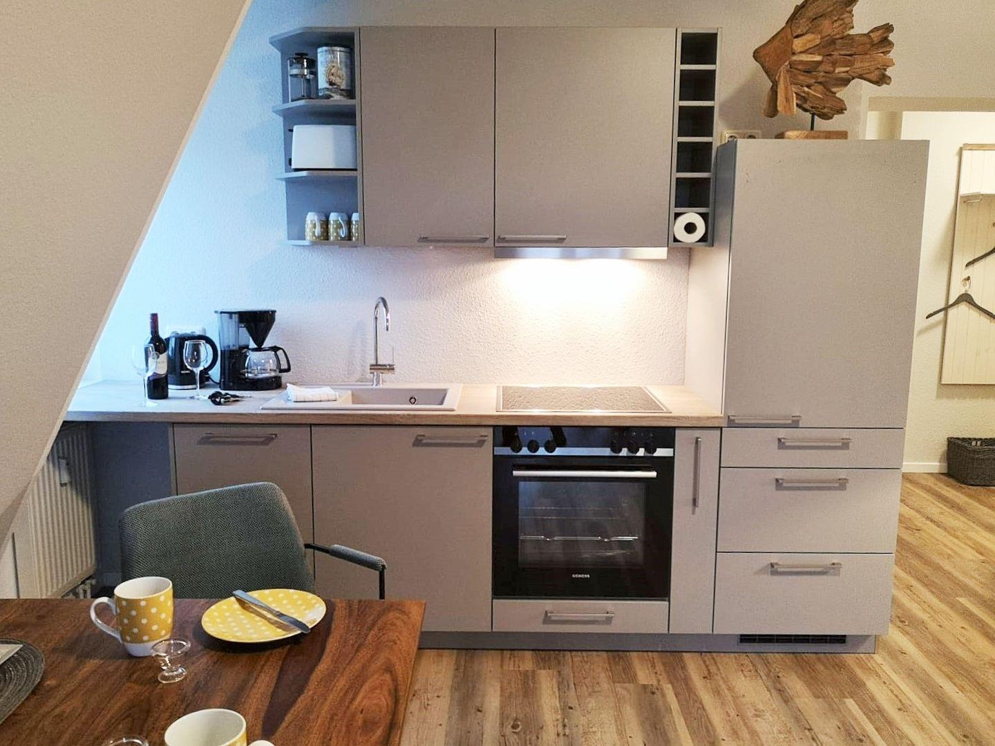 Die offene Küche beinhaltet eine voll ausgestattete Einbauküchenzeile mit 4-Platten-Ceran-Kochfeld, Backofen, Dunstabzug, Kühlschrank mit Gefrierfach, Geschirrspülmaschine, Kaffeemaschine, Wasserkocher, Toaster und Eierkocher. Die Küche ist mit Geschirr, Gläsern, Besteck und Töpfen bestens und ausreichend ausgestattet.