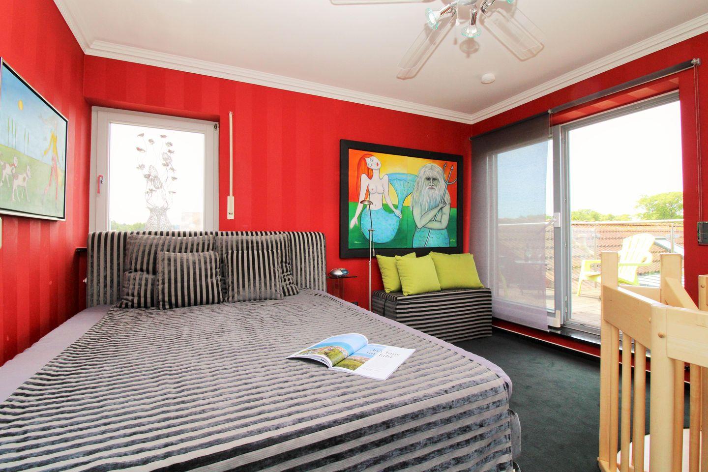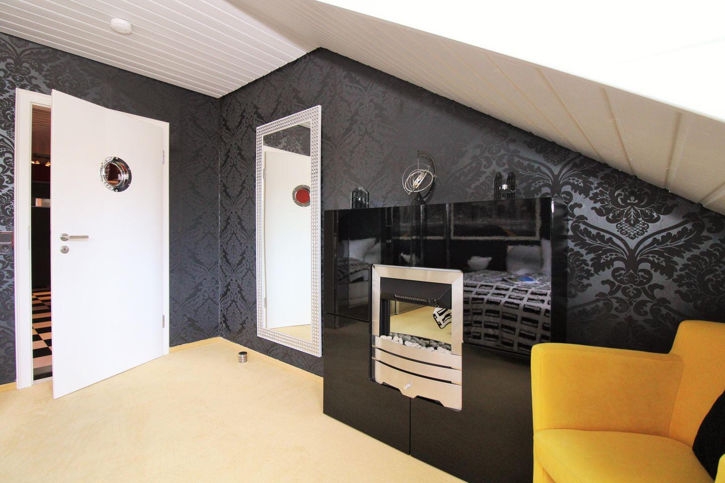 Das exklusive, sehr geräumige und hochwertig eingerichtete 1. Schlafzimmer ist mit einem bequemen runden Doppelbett, einem Sessel sowie einem sehr großen Kleiderschrank eingerichtet und verfügt für ein gemütliches Ambiente über einen romantischen elektrischen Kamin.