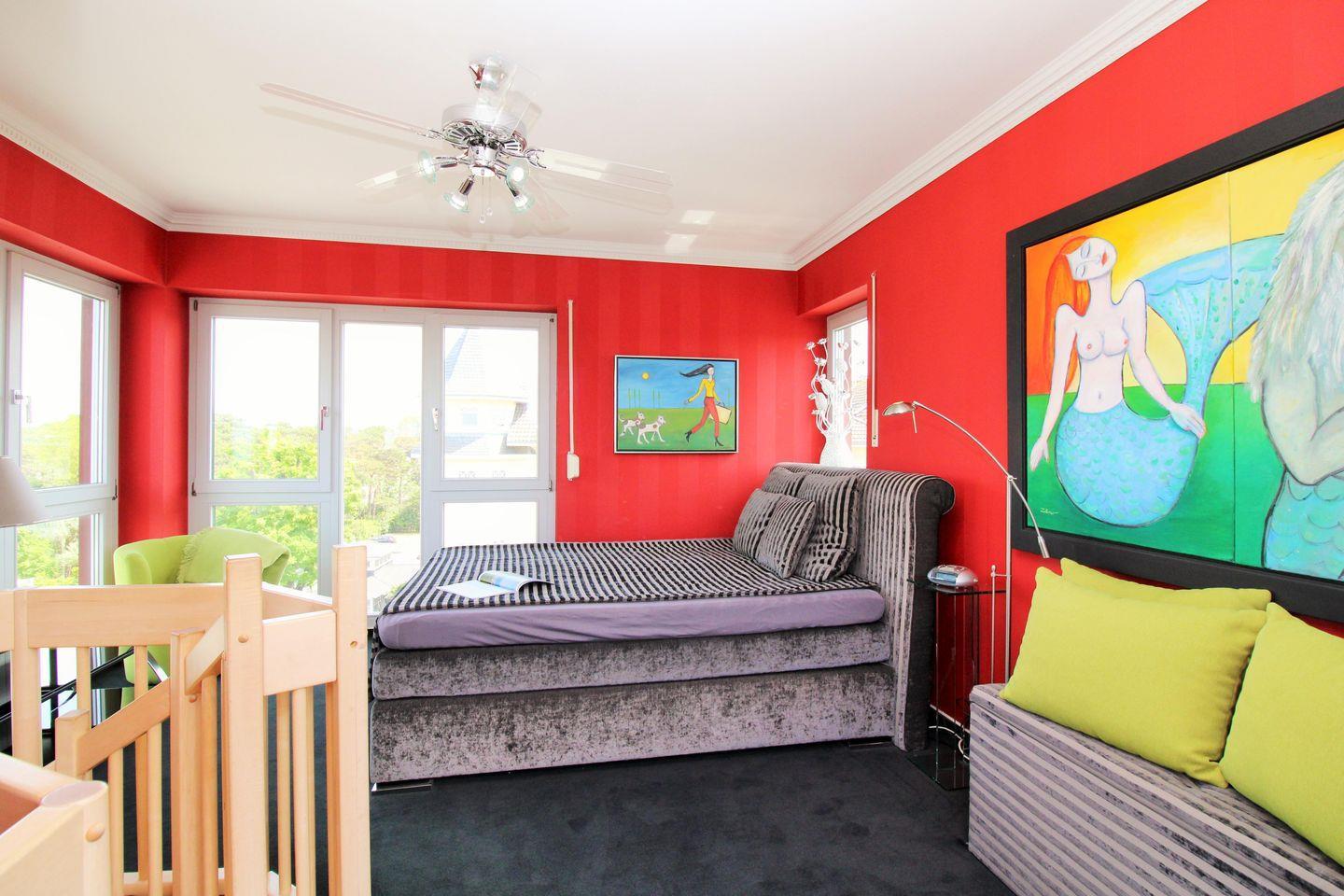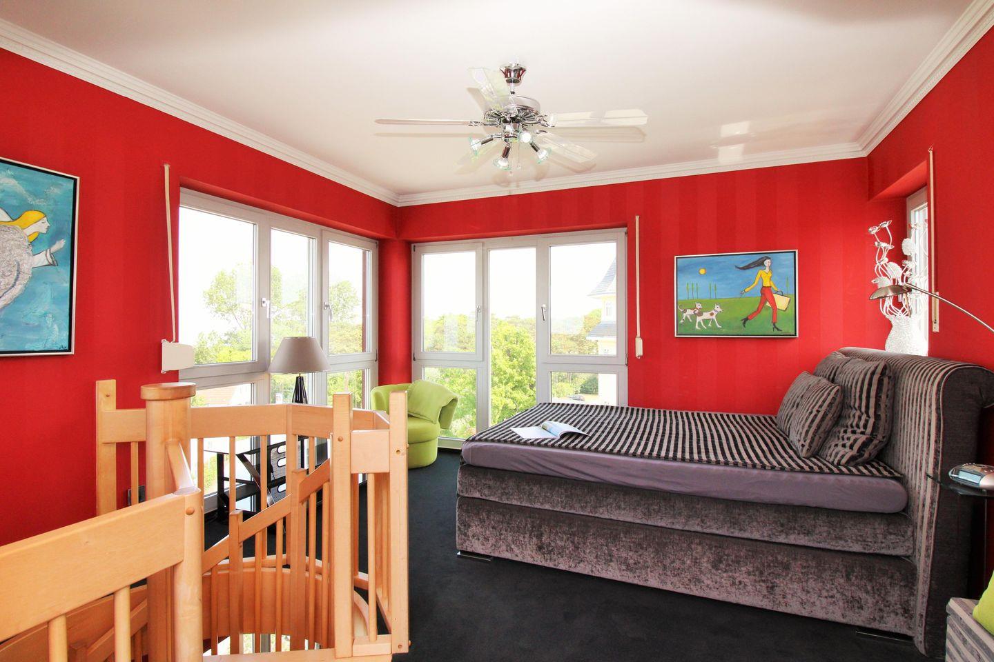 Das lichtdurchflutete und separate 2. Schlafzimmer im Turm des Obergeschosses verfügt ebenfalls über ein bequemes Doppelbett und bietet den Gästen ein besonderes Highlight: einen traumhaften Blick auf die unmittelbar vor Ihnen liegende Ostsee direkt vom Bett!