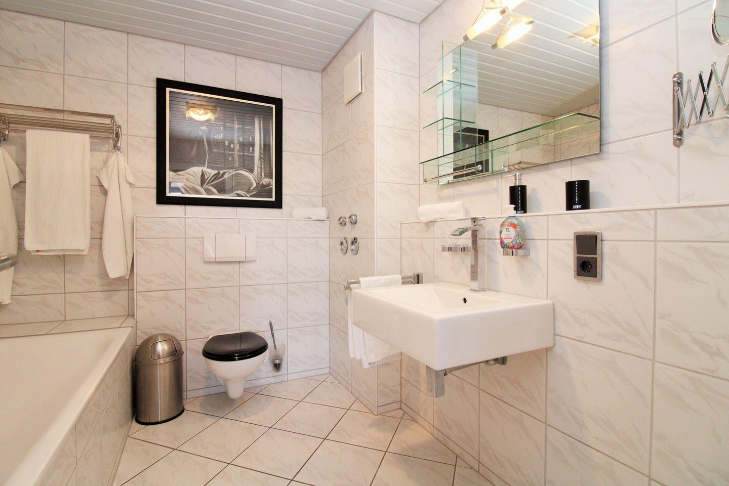 Das geräumige Badezimmer verfügt über eine Dusche sowie zusätzlich eine Badewanne, Waschbecken mit Kosmetikspiegel, WC, einen Handtuch-Heizkörper sowie ausreichend Ablagemöglichkeiten.