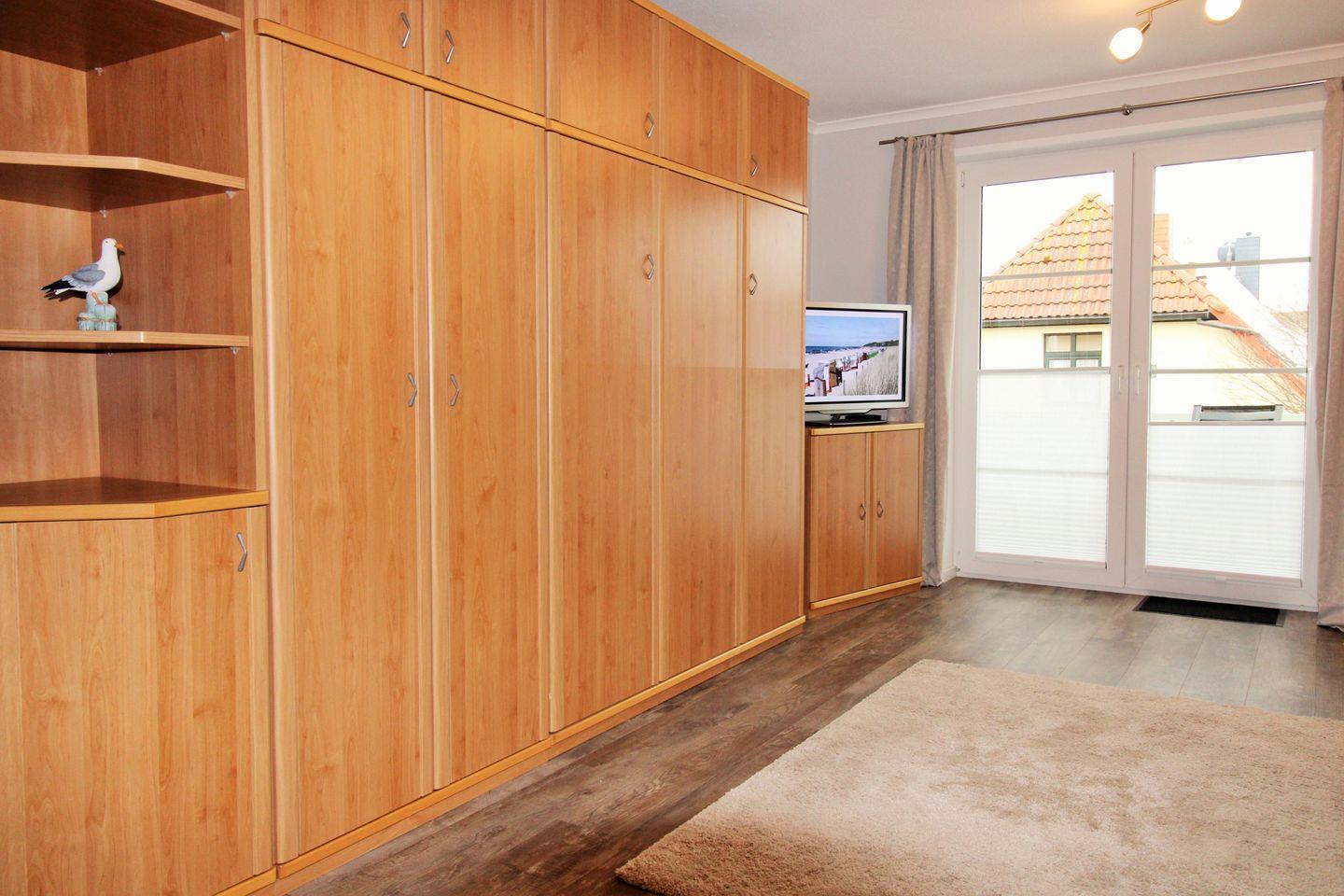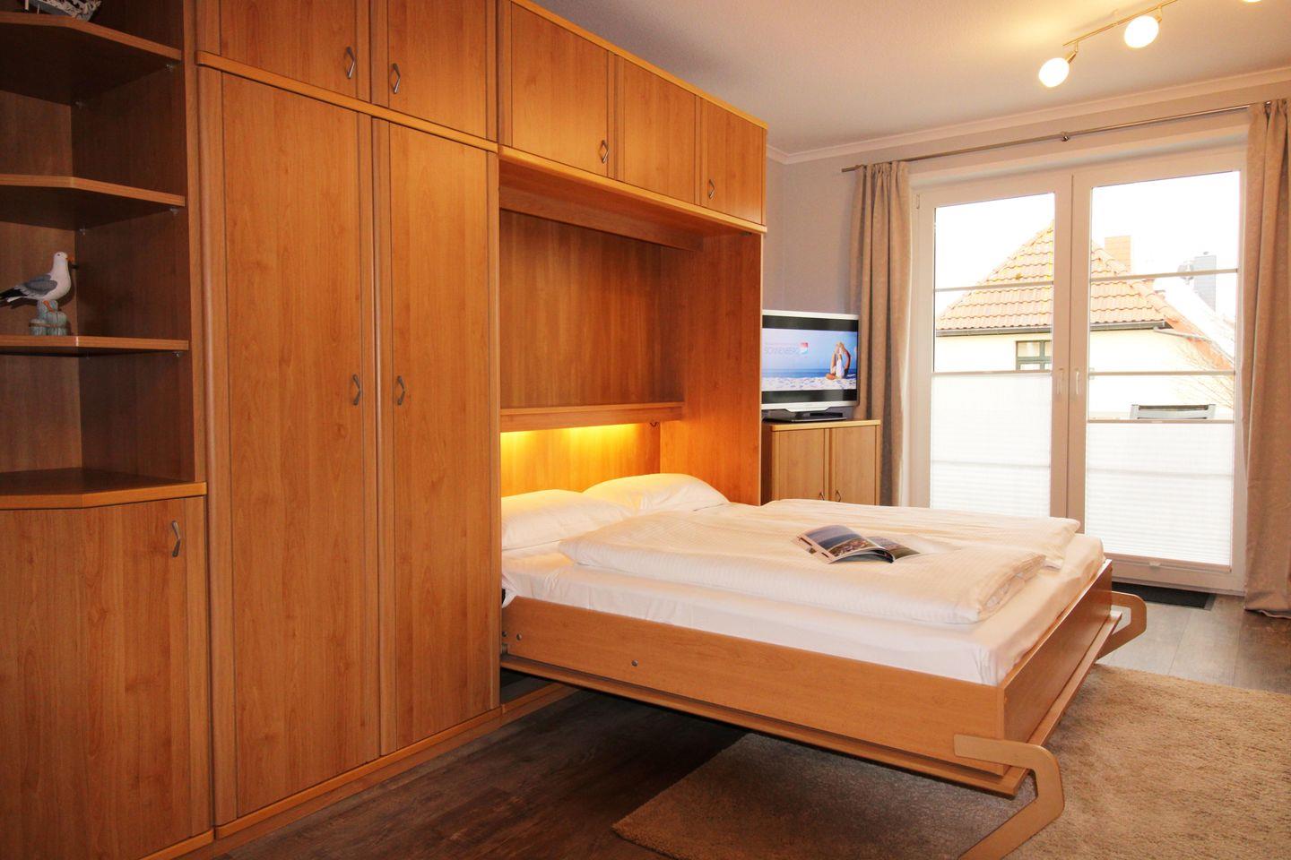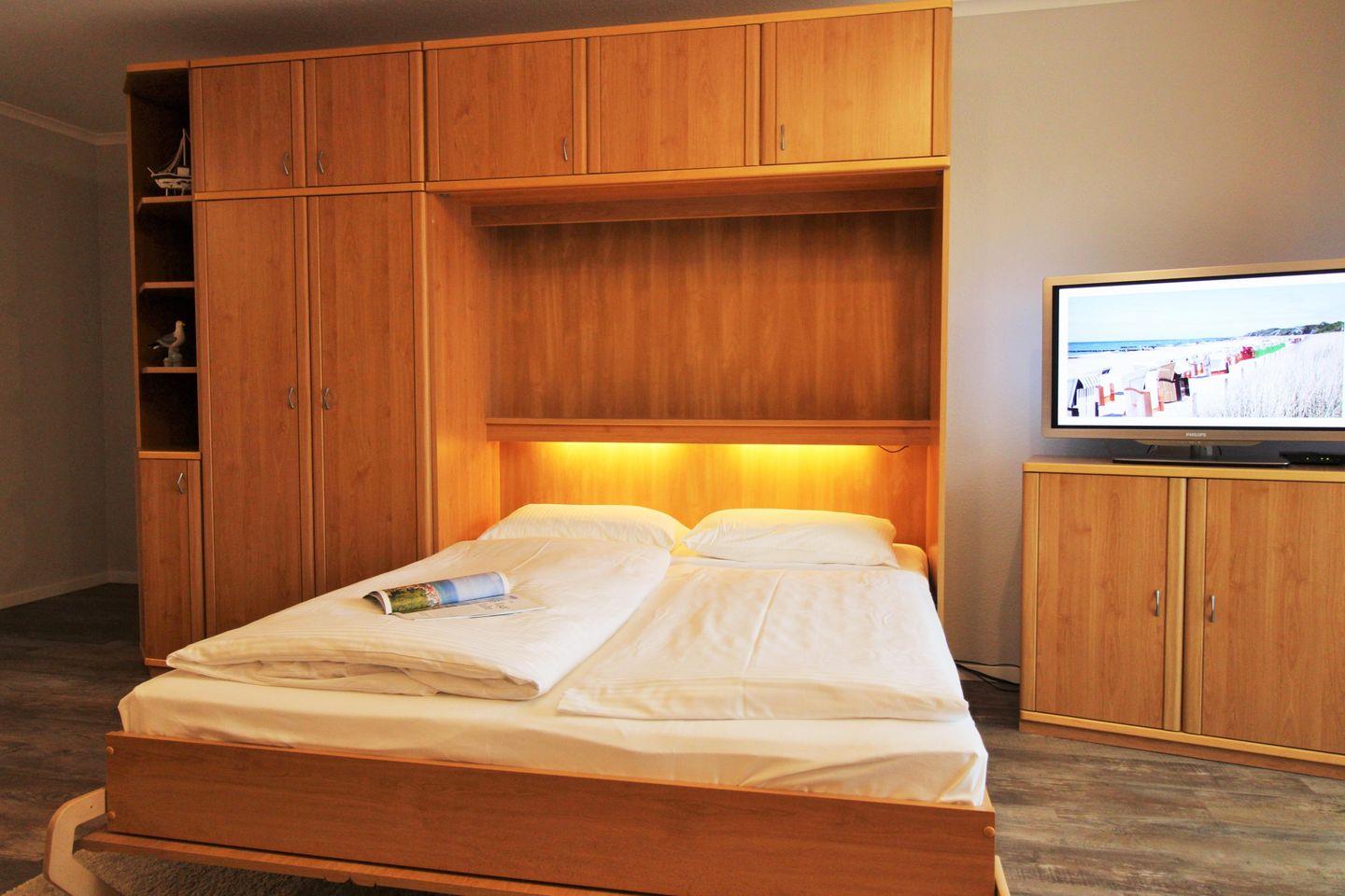 Der Schlafbereich ist mit einem praktischen ausklappbaren Schrankbett (1,60 x 2,00 m) für 2 Personen sowie einem großen Kleiderschrank ausgestattet. Sofern Sie das Bett tagsüber nicht benötigen, können Sie es einfach im Schrank verschwinden lassen. Nachts bietet es Ihnen besten und bequemen Schlafkomfort. Eine zusätzliche bequeme Schlafmöglichkeit für eine 3. Person bietet die ausziehbare Schlafcouch im Wohnzimmer.