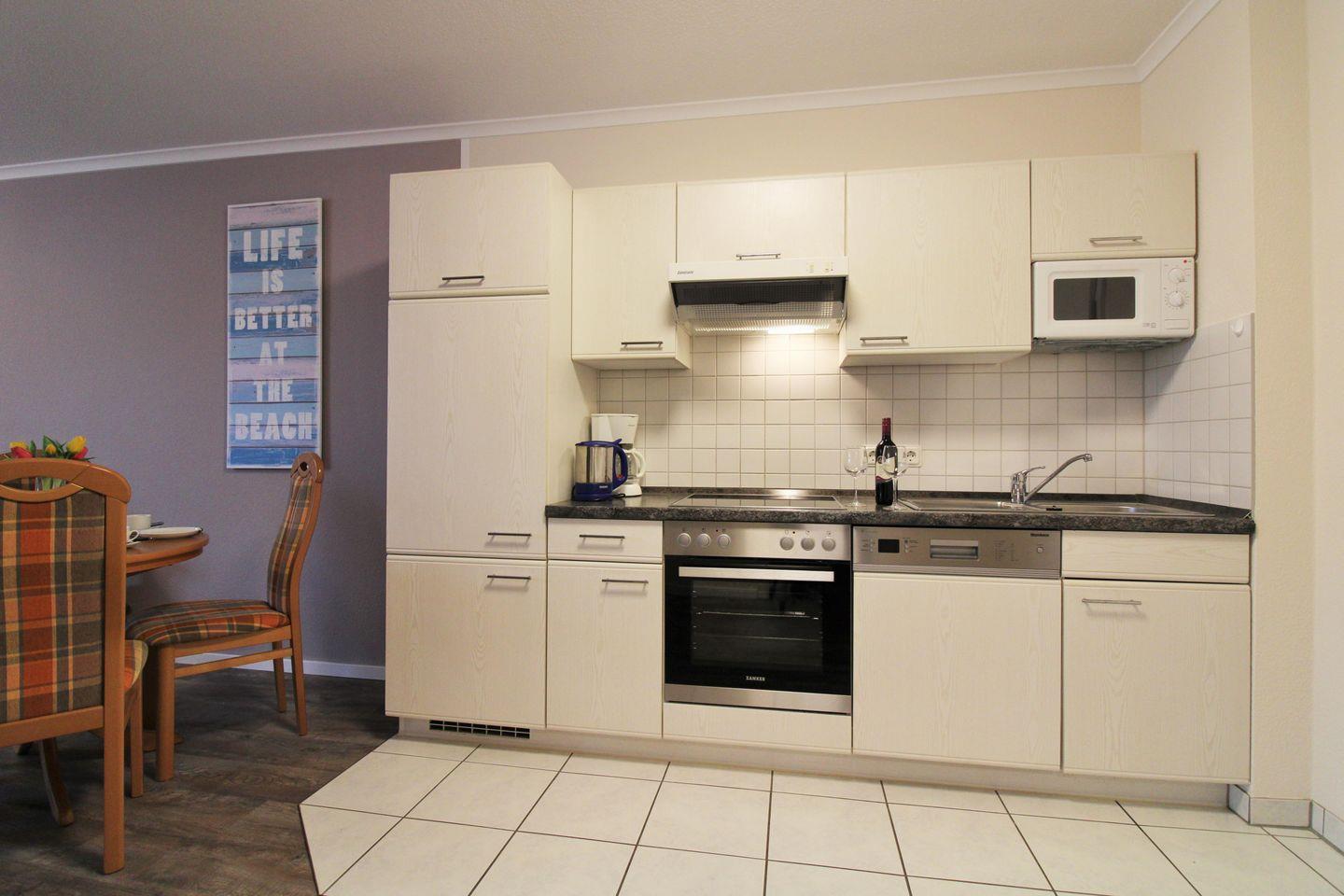 Die offene Küche beinhaltet eine voll ausgestattete Einbauküchenzeile mit 4-Platten-Ceranfeld, Backofen, Mikrowelle, Dunstabzug, Kühlschrank, Geschirrspülmaschine, Kaffeemaschine, Wasserkocher und Toaster. Die Küche ist mit Geschirr, Gläsern, Besteck und Töpfen bestens und ausreichend ausgestattet.