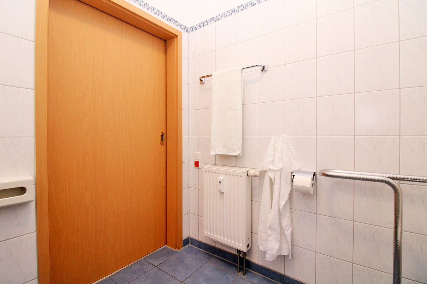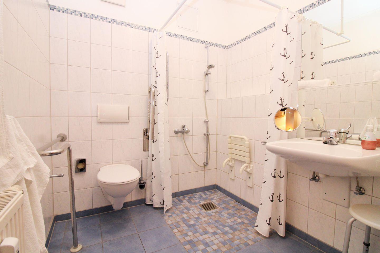 Das große und helle Badezimmer verfügt über eine behindertengerechte und rollstuhl-geeignete (ebenerdige) Dusche, Waschbecken, WC, Kosmetikspiegel, Föhn sowie ausreichend Ablagemöglichkeiten. Ein fest in der Dusche integrierter Duschstuhl steht ebenfalls zur Verfügung. Das Waschbecken ist für Rollstuhlfahrer unterfahrbar und es gibt einen zusätzlichen niedrigen Wandspiegel, damit sowohl sitzende als auch stehende Personen sich gut sehen können. Neben der Toilette befindet sich ein fest integrierter Haltegriff.