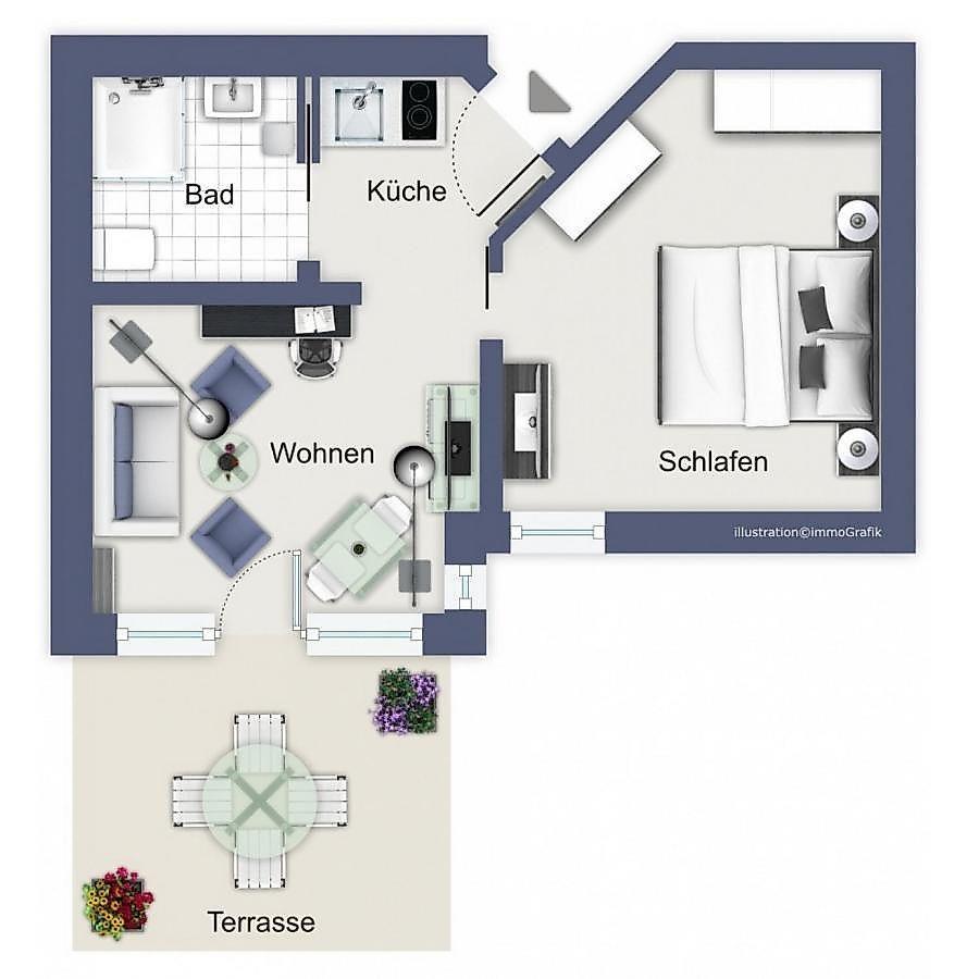 Die freundliche und behindertengerechte 2-Zimmer-Wohnung (ca. 41 m²) im Erdgeschoss besitzt ein hohes Maß an Funktionalität und ist komplett eingerichtet. Alle Böden der Wohnung sind gefliest.