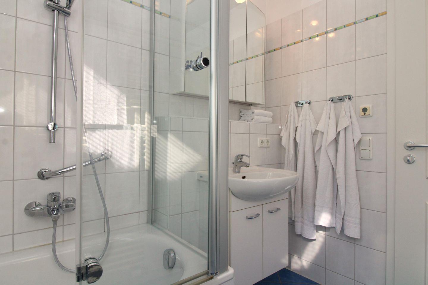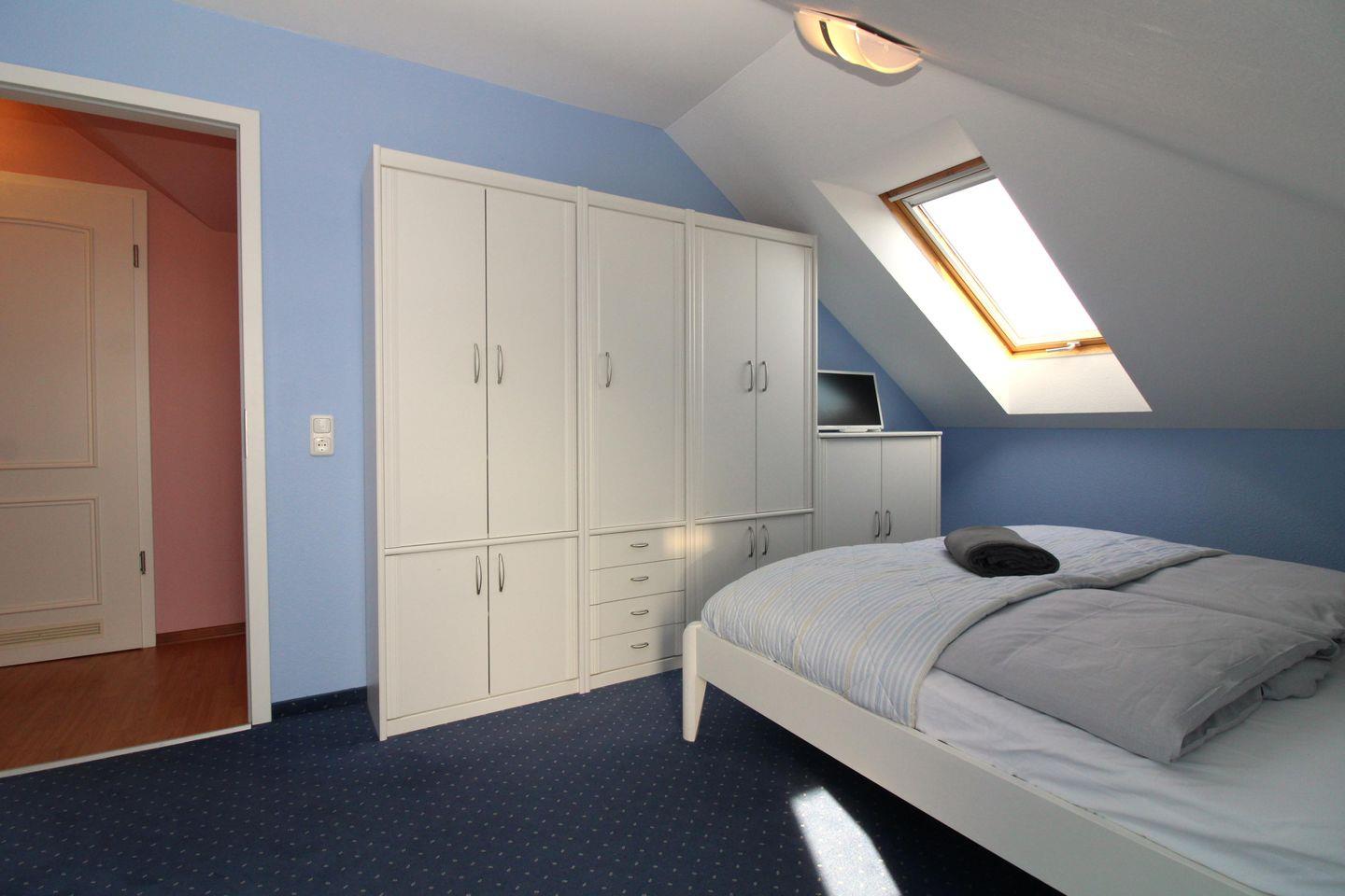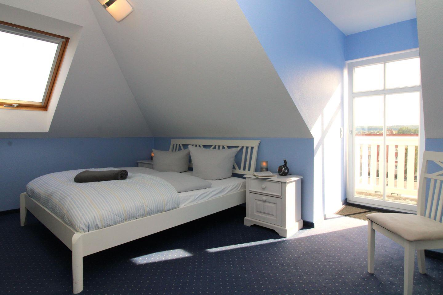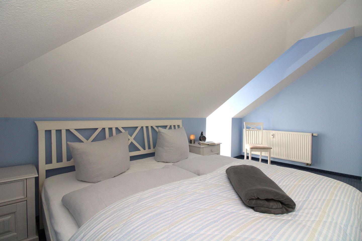 Das freundliche und maritim wirkende 1. Schlafzimmer ist mit einem bequemen Doppelbett (180 x 200 cm), Nachttischen, einem geräumigen Kleiderschrank, einer Kommode, einem Stuhl sowie einem TV-Gerät eingerichtet und bietet Zugang zum dem 2. Balkon (nach Süden ausgerichtet). Hier sitzen Sie entspannt und gemütlich mit weitem Blick über die Dächer und in die Landschaft und können abends bei einem guten Glas Wein in Ruhe die lauen Sommernächte genießen!