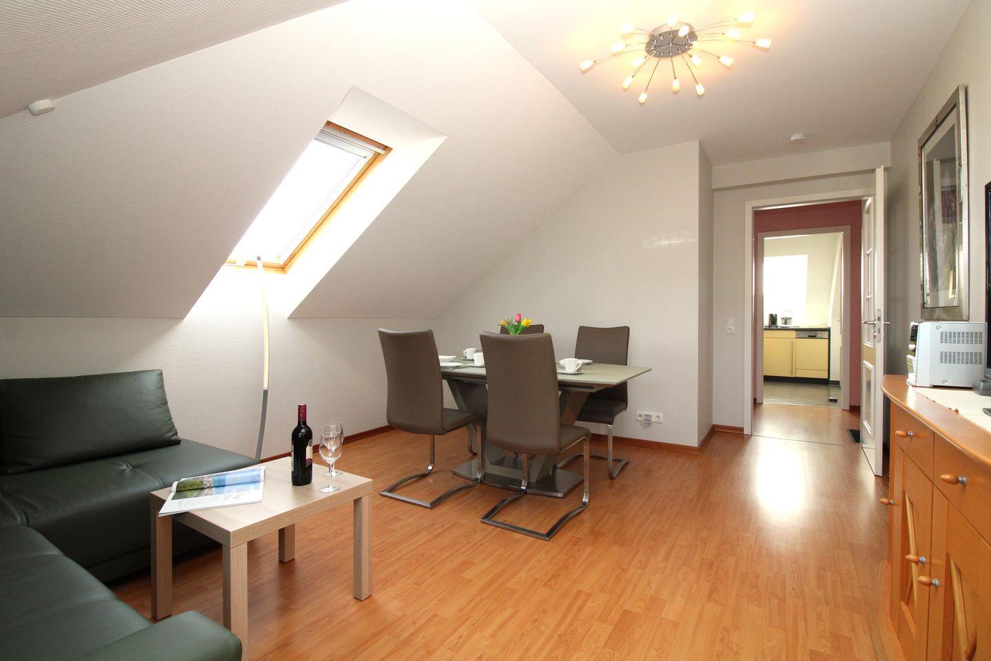 Das elegante und großzügige Wohn-/Esszimmer verfügt über eine separate Sitzgruppe mit bequemer Eck-Couch und Couchtisch, einen separaten Esstisch mit 4 Stühlen sowie ein geräumiges Sideboard. Vom Wohnzimmer aus haben Sie direkten Zugang zu dem seeseitigen Balkon (nach Norden ausgerichtet) mit Balkonmöbeln. Hier sitzen Sie entspannt und können in Ruhe Ihre Urlaubstage genießen! Einen weiteren großen Sonnenbalkon (nach Süden ausgerichtet) erreichen Sie über das 1. Schlafzimmer.