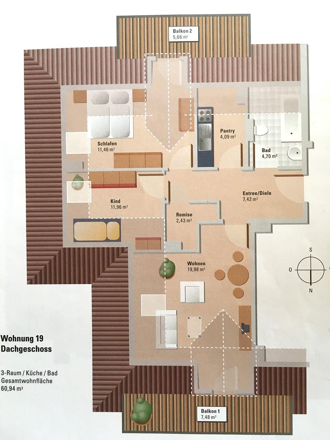 Die geräumige und hochwertig eingerichtete 3-Zimmer-Wohnung (ca. 61 m²) im 4. OG (Dachgeschoss) besitzt ein hohes Maß an Funktionalität und ist komplett eingerichtet. Der Bodenbelag im Flur sowie dem Wohn-/Esszimmer ist Holzlaminat, in den Schlafzimmern Teppichboden, die Küche sowie das Badezimmer/WC sind gefliest.