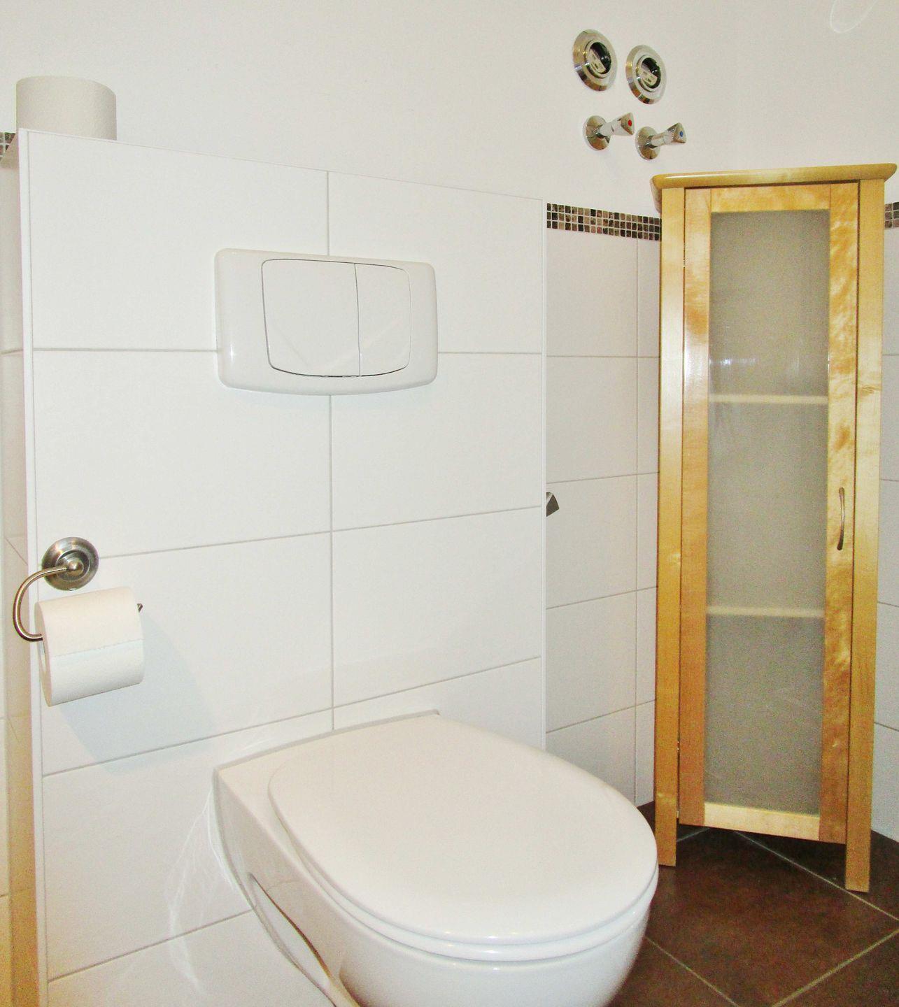 Das helle Badezimmer (mit Fußbodenheizung) verfügt über eine Dusche mit niedrigem Einstieg, Waschbecken und WC, einen Handtuch-Heizkörper sowie einen geräumigen Bade-zimmerschrank.