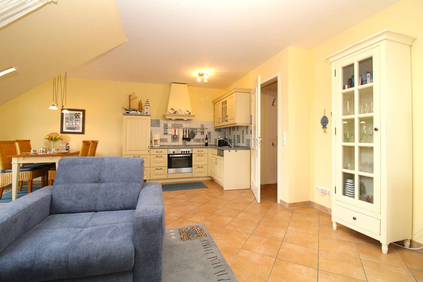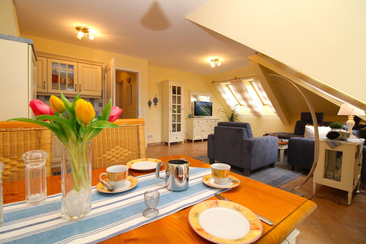 Das freundliche und helle Wohn-/Esszimmer verfügt über eine separate Sitzgruppe mit bequemer Couch, Sessel und Couchtisch, einen separaten Esstisch mit 4 Stühlen sowie ein Sideboard und verschiedene Schränke. Vom Wohnzimmer aus haben Sie direkten Zugang zu dem großen Balkon (nach Norden ausgerichtet) mit seitlichem teilweisen Meerblick sowie Balkonmöbeln. Hier sitzen Sie entspannt und können in Ruhe den wunderschönen Blick über die Dächer und Gärten von Kühlungsborn bis hin zum Leuchtturm nach Bastorf genießen!