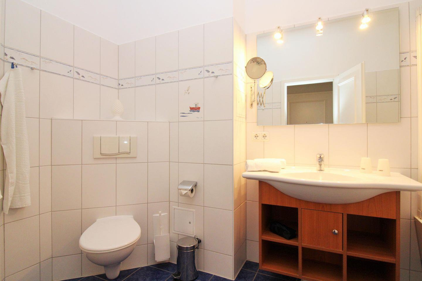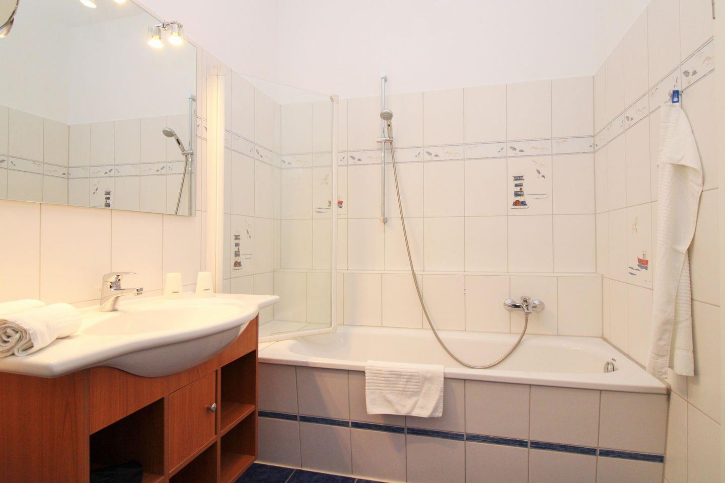 Das helle und freundliche Badezimmer verfügt über eine Badewanne, Waschbecken und WC, Kosmetikspiegel, einen Handtuch-Heizkörper sowie ausreichend Ablagemöglichkeiten.
