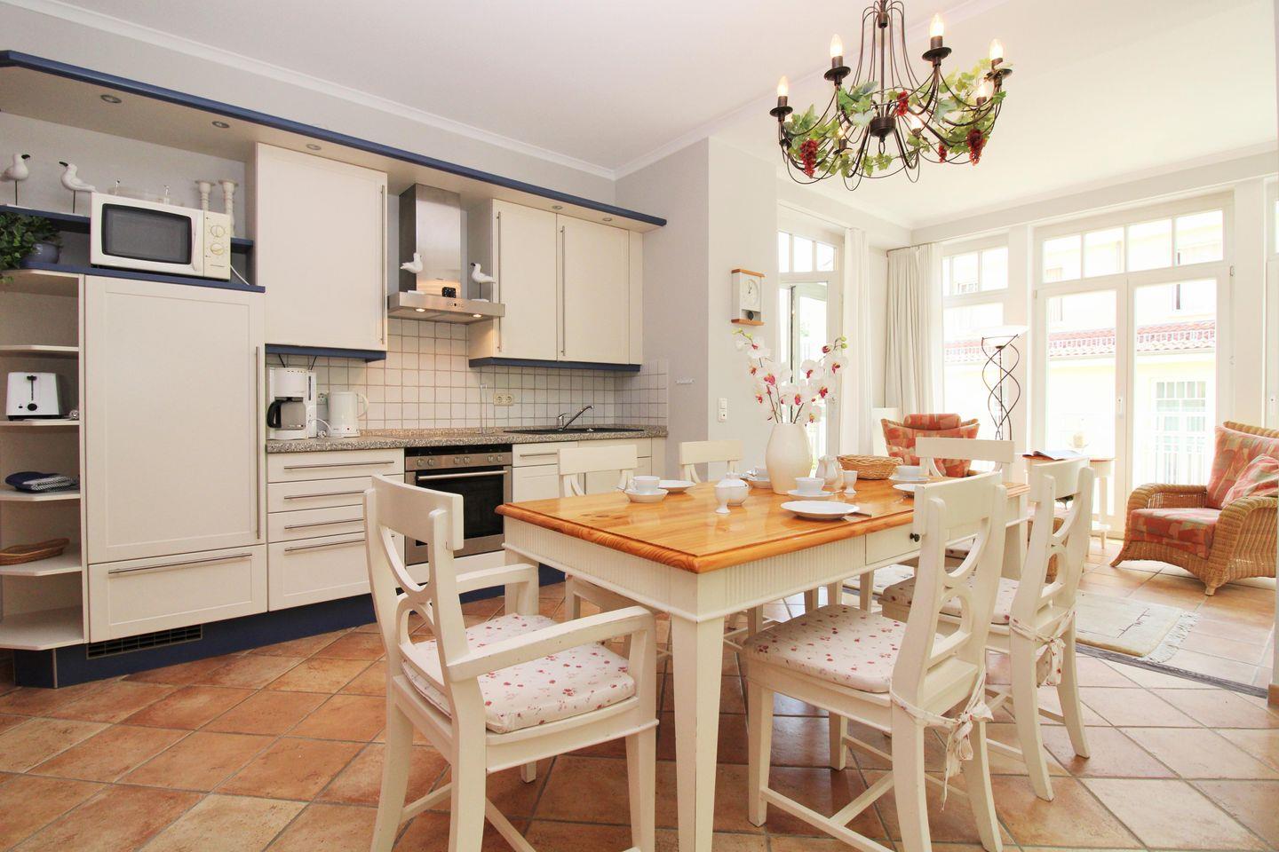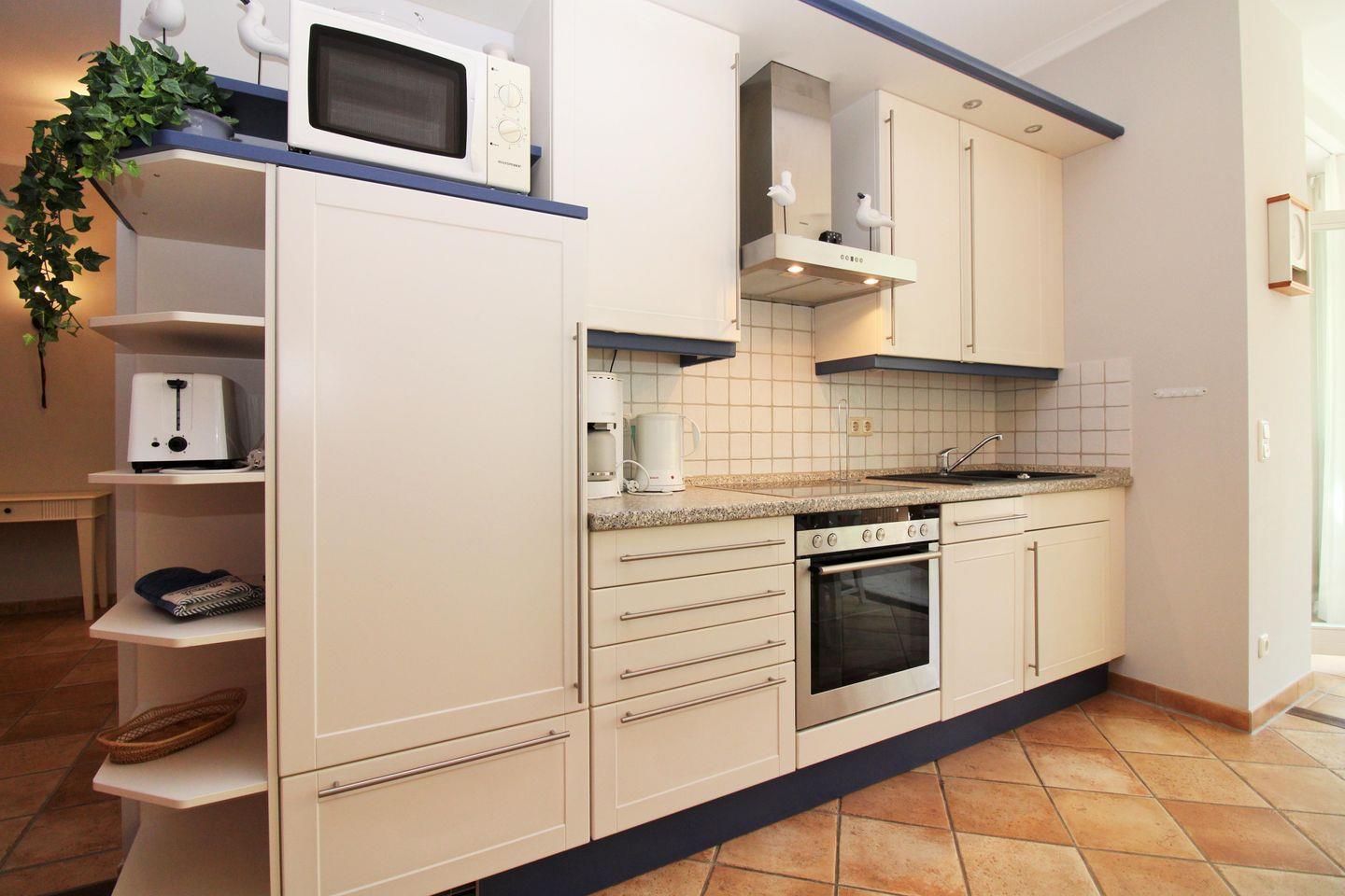 Die offene Küche beinhaltet eine voll ausgestattete Einbauküchenzeile mit 4-Platten-Ceran-Kochfeld, Backofen, Mikrowelle, Dunstabzug, Kühlschrank mit Gefrierfach, Geschirrspül-maschine, Kaffeemaschine, Wasserkocher und Toaster. Die Küche ist mit Geschirr, Gläsern, Besteck und Töpfen bestens und ausreichend ausgestattet.