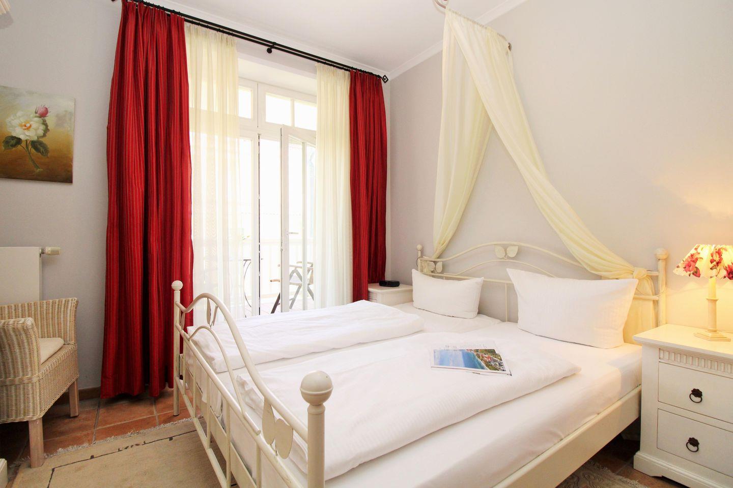 Das gemütliche 1. Schlafzimmer ist mit einem bequemen Doppelbett, Nachttischen, einem Sessel sowie einem geräumigen Kleiderschrank eingerichtet und hat ebenfalls einen direkten Zugang zum Balkon.