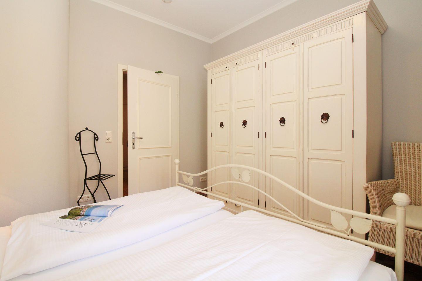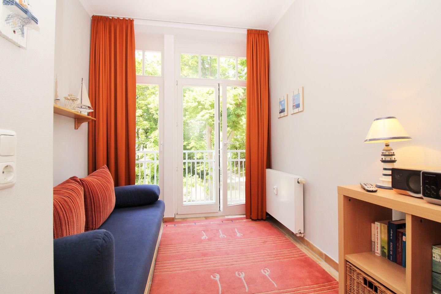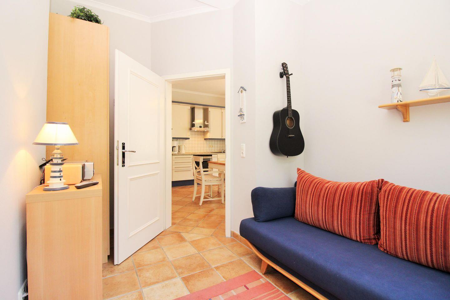 Das zusätzliche 2. Schlafzimmer mit direktem Blick auf die Ostsee verfügt über eine ausziehbare Schlafcouch, einen Kleiderschrank und ein kleines Regal.