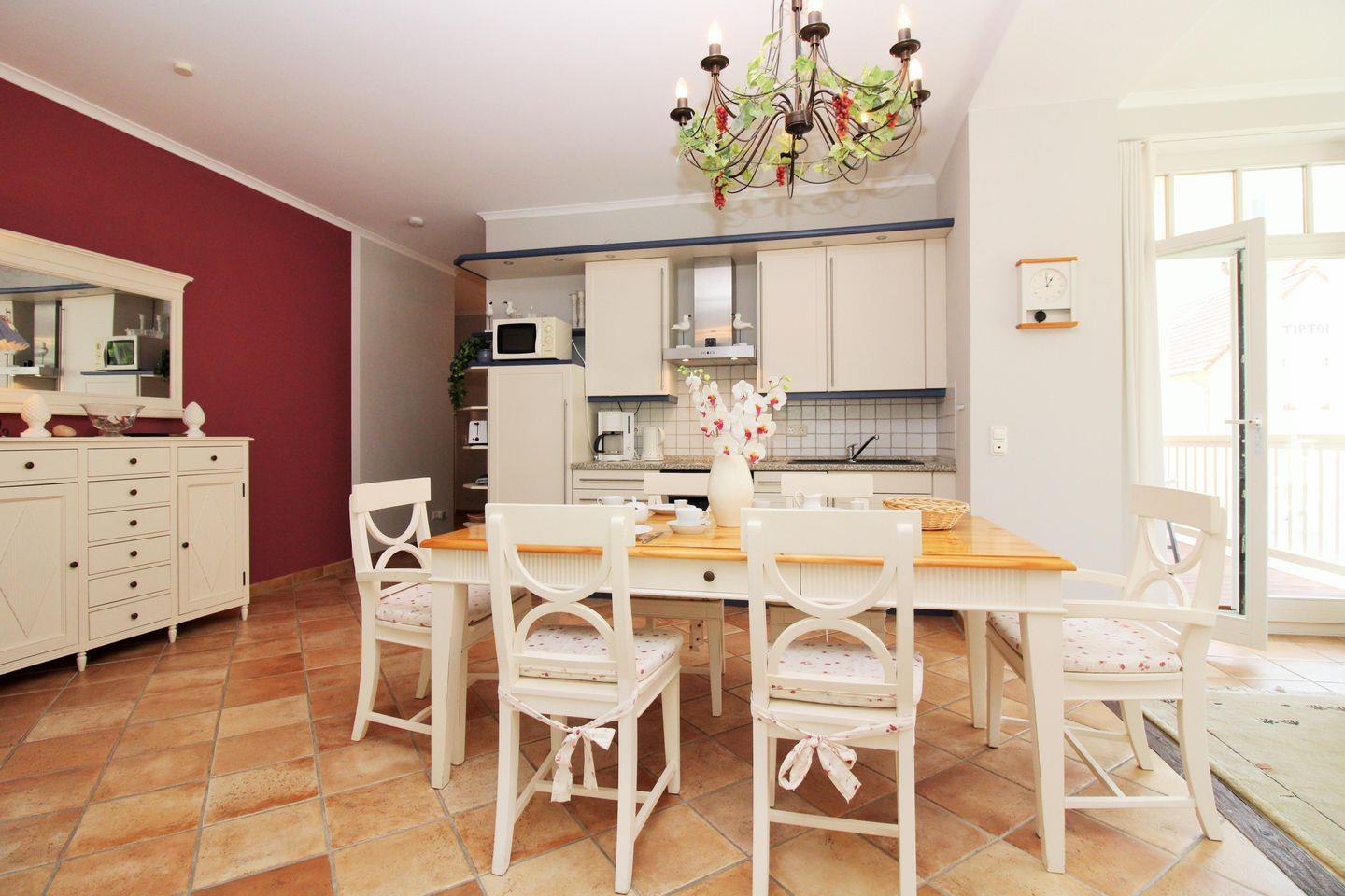 Das geräumige, lichtdurchflutete und sehr geschmackvoll eingerichtete Wohn-/Esszimmer mit großen bodentiefen Fenstern im gesamten Raum sowie herrlichem direktem Meerblick verfügt über eine Sitzgruppe mit bequemer Couch, Sesseln, Hocker und Couchtisch, eine separate Essecke mit Esstisch und 6 Stühlen sowie verschiedene Schränke und Sideboards. Vom Wohnzimmer aus haben Sie direkten Zugang zu dem ca. 5 m² großen und teilweise überdachten Balkon (nach Westen ausgerichtet) mit Balkonmöbeln - hier sitzen Sie entspannt und genießen den seitlichen schönen Blick auf die Strandpromenade und die Ostsee!
