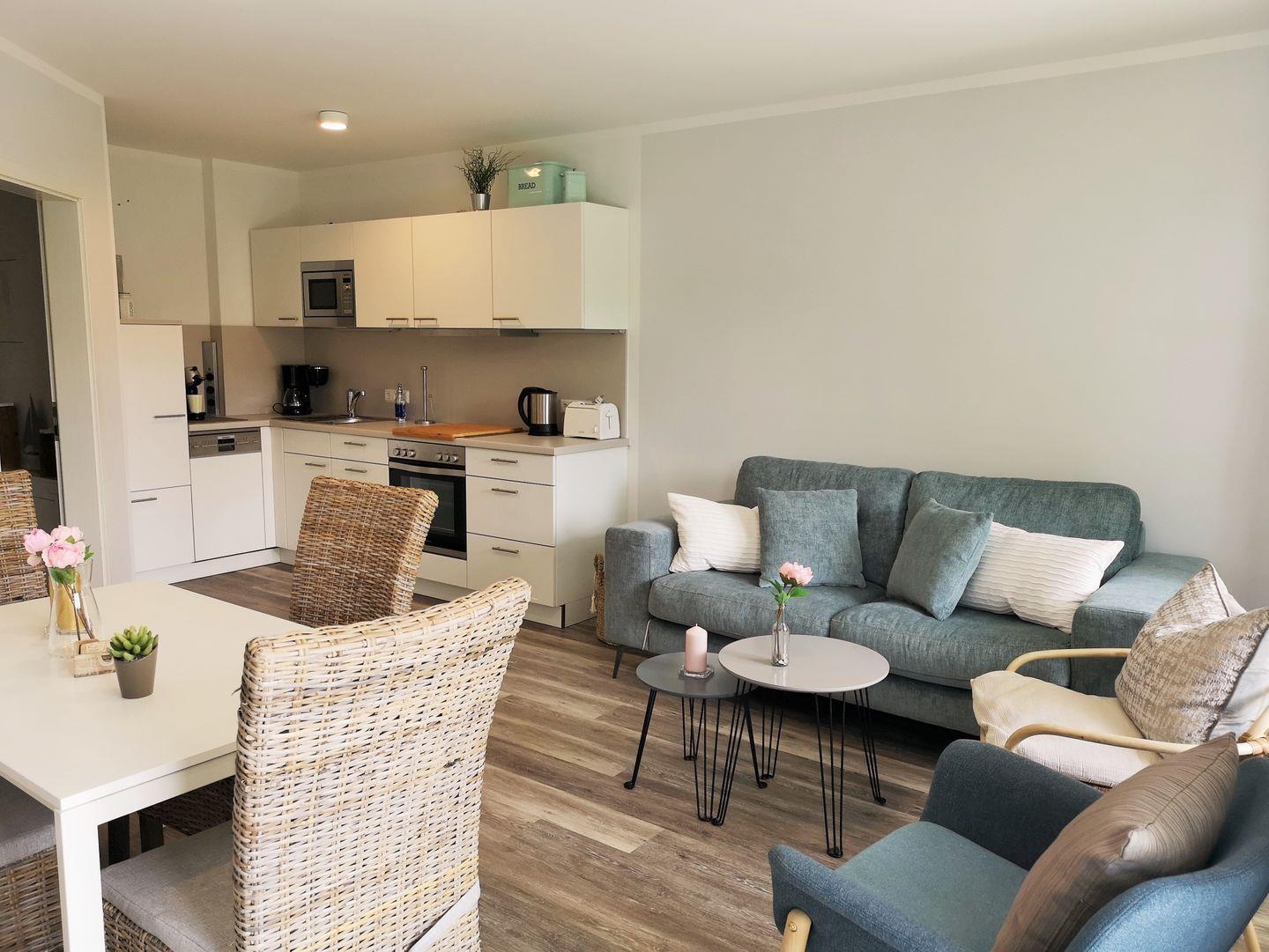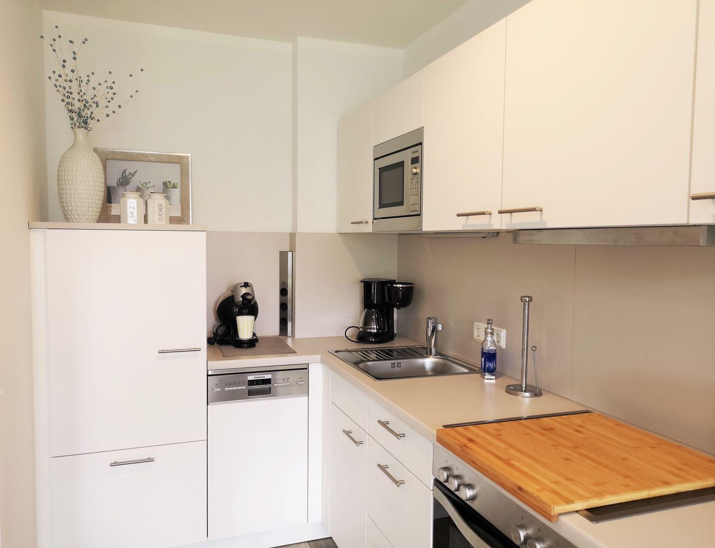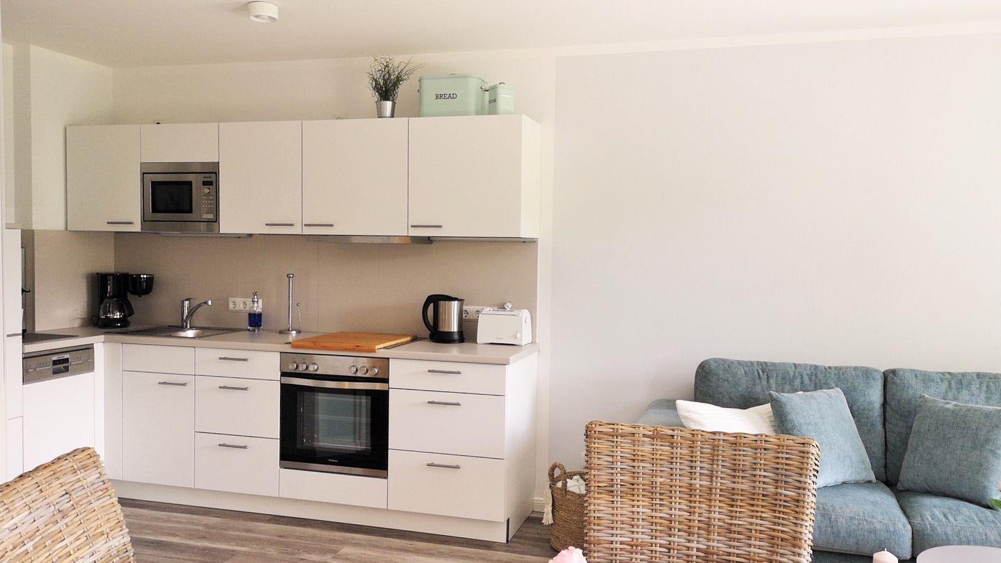 Die moderne offene Küche beinhaltet eine voll ausgestattete Einbauküchenzeile mit 4-Zonen-Ceran-Kochfeld, Backofen, Mikrowelle, Dunstabzug, Kühlschrank mit Gefrierfach, Geschirrspülmaschine, Kaffeemaschine, Wasserkocher und Toaster. Die Küche ist mit Geschirr, Gläsern, Besteck und Töpfen bestens und ausreichend ausgestattet.