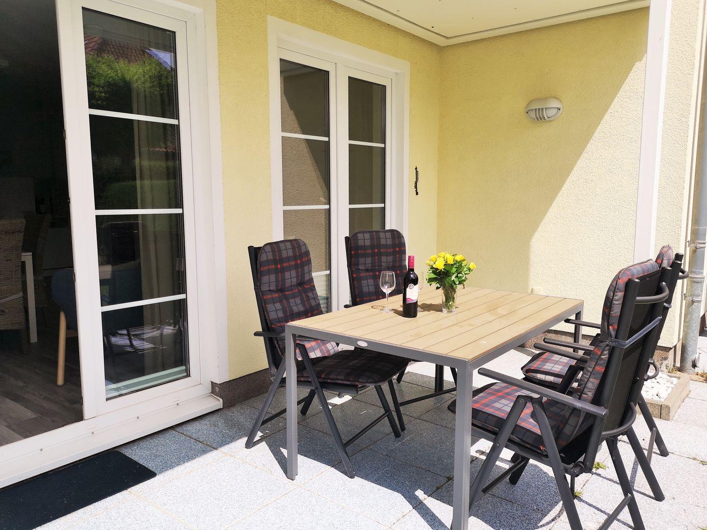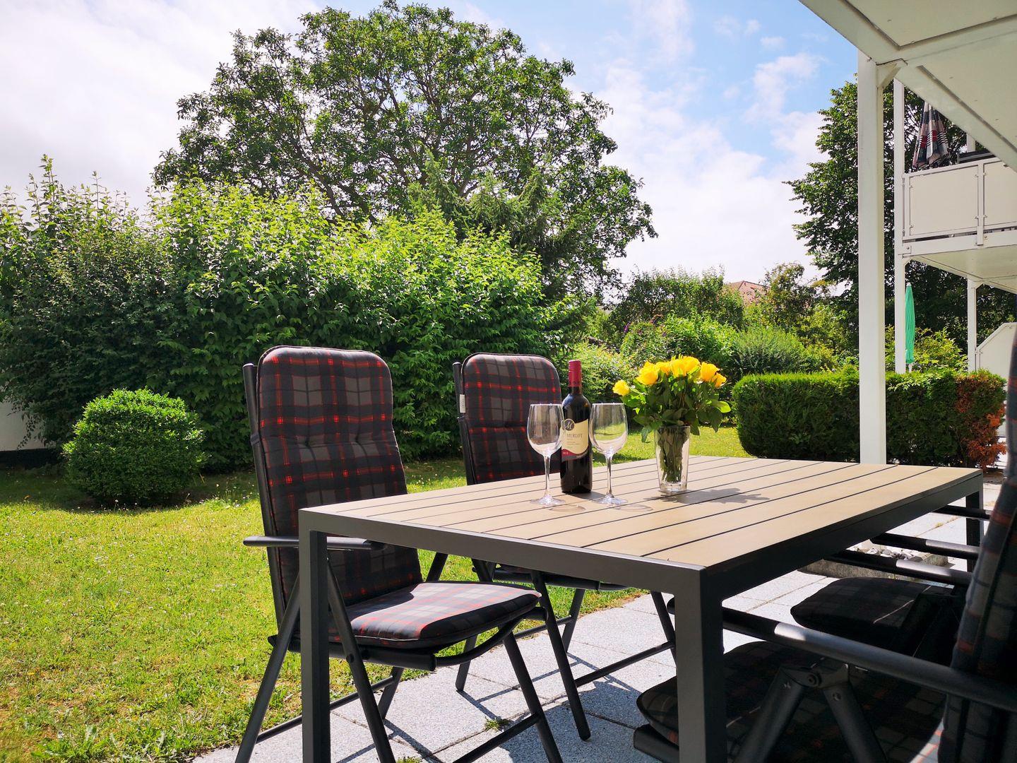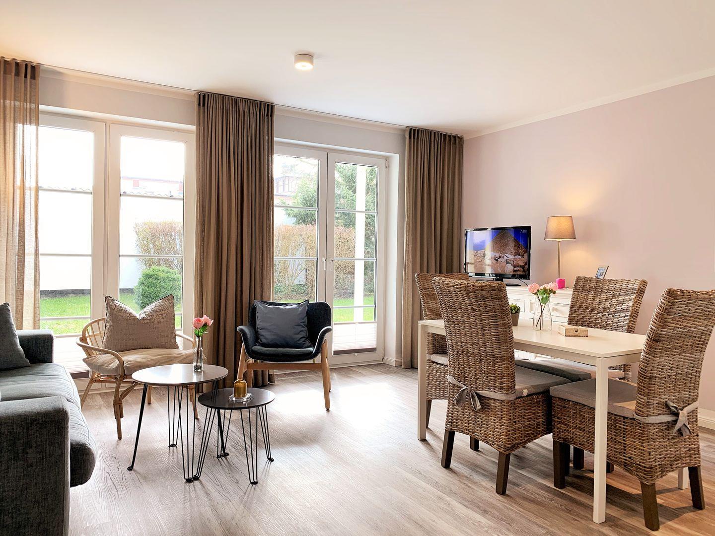 Das helle, moderne und sehr gemütlich eingerichtete Wohn-/Esszimmer verfügt über eine separate Sitzgruppe mit einer bequemen Couch mit Sesseln, Couchtisch, einen separaten Esstisch mit 4 Stühlen sowie ein Sideboard. Vom Wohnzimmer aus haben Sie direkten Zugang zu der ca. 12 m² großen, sonnigen sowie überdachten Terrasse (nach Süden ausgerichtet) mit Terrassenmöbeln - hier sitzen Sie entspannt und gemütlich mitten im Grünen und können bei einem guten Glas Wein die lauen Sommernächte genießen …!