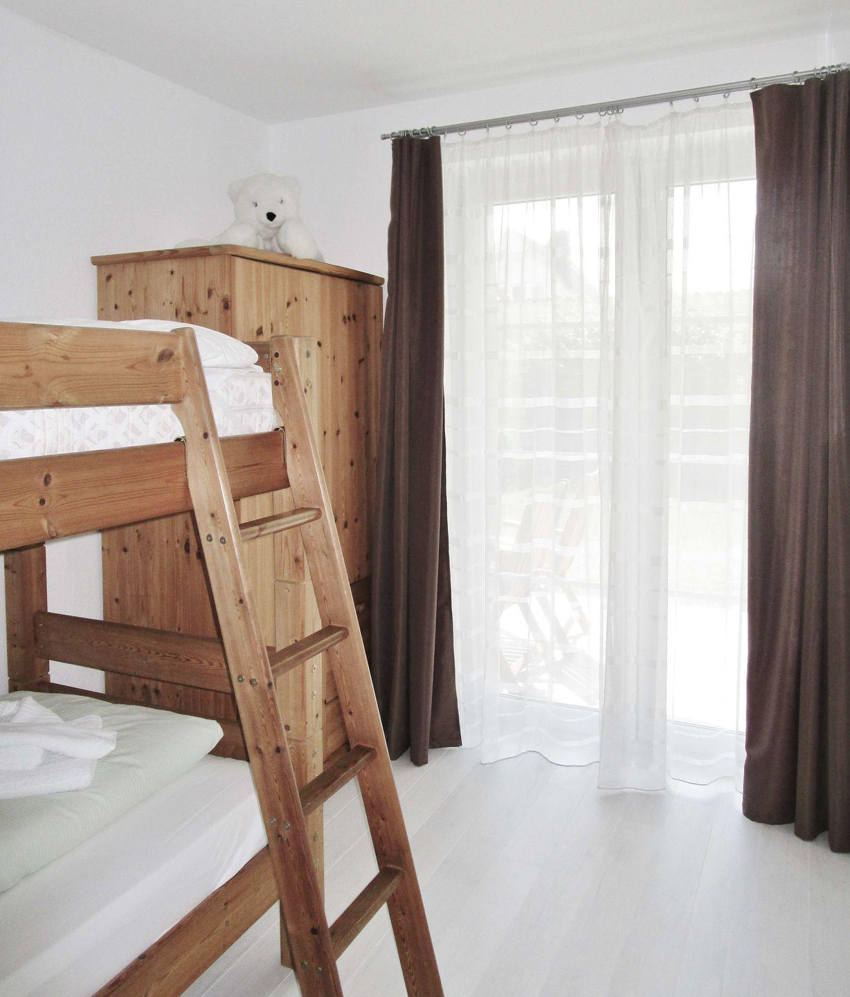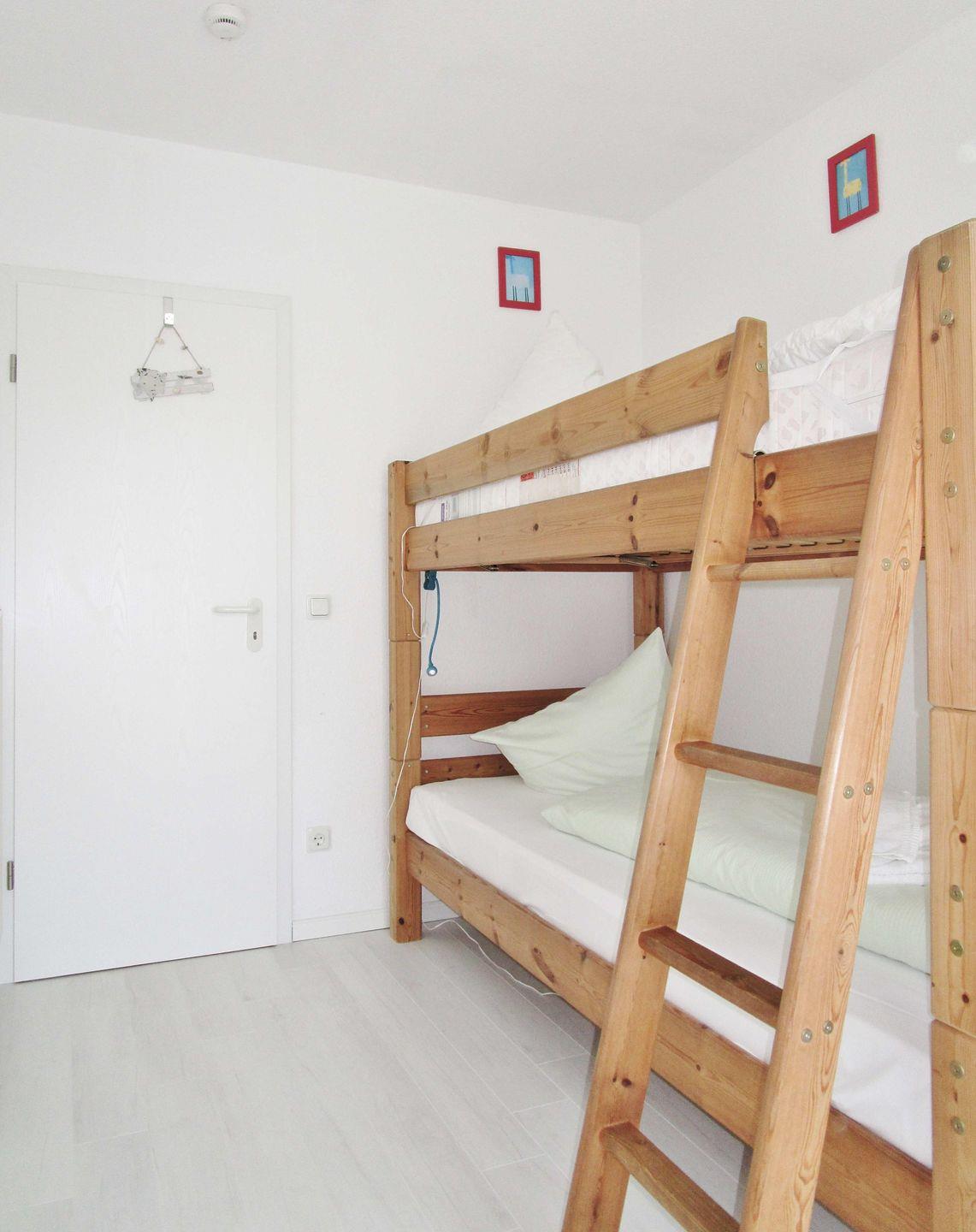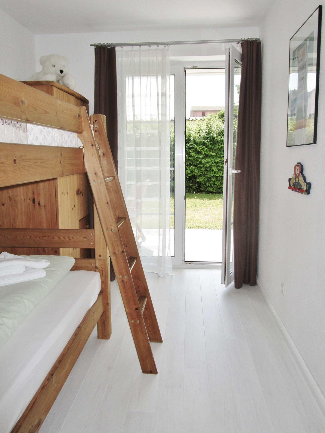 Das freundliche, helle und separate 2. Schlafzimmer verfügt über ein bequemes Doppelstockbett und einen Kleiderschrank - auch von diesem Zimmer aus haben Sie direkten Zugang zur Terrasse.