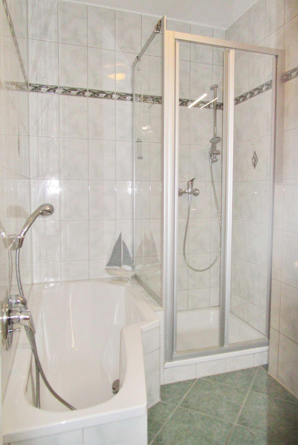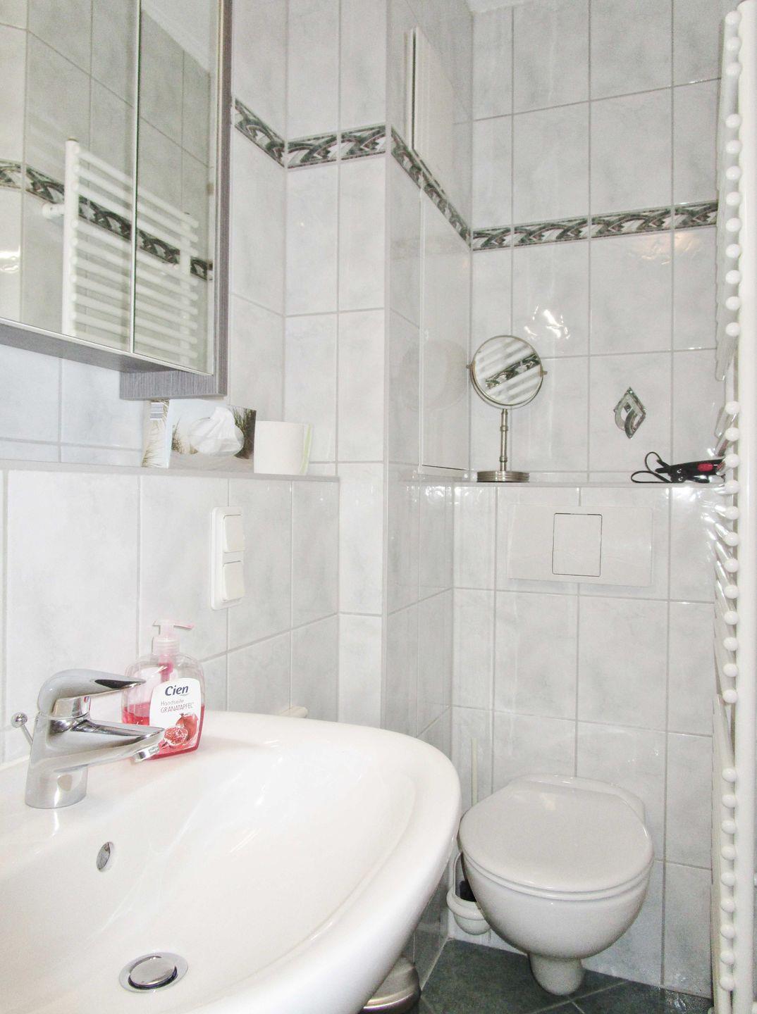 Das helle und geräumige Badezimmer verfügt über Dusche und Badewanne, Waschbecken, WC, einen Badezimmerschrank, Kosmetikspiegel, Handtuch-Heizkörper und bietet ausreichend Ablagemöglichkeiten.