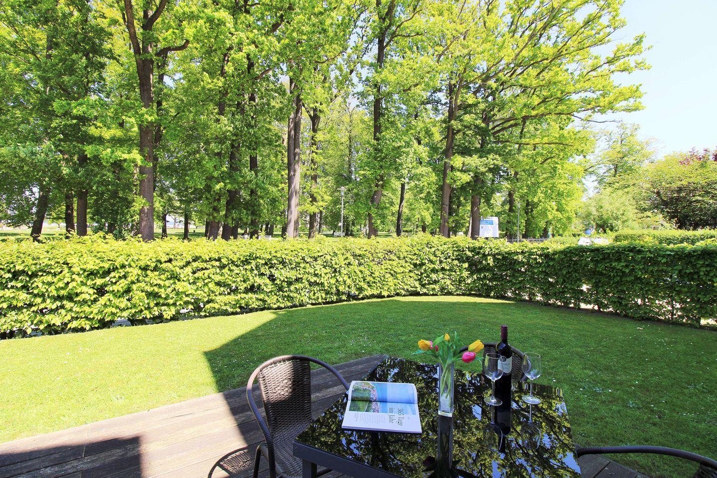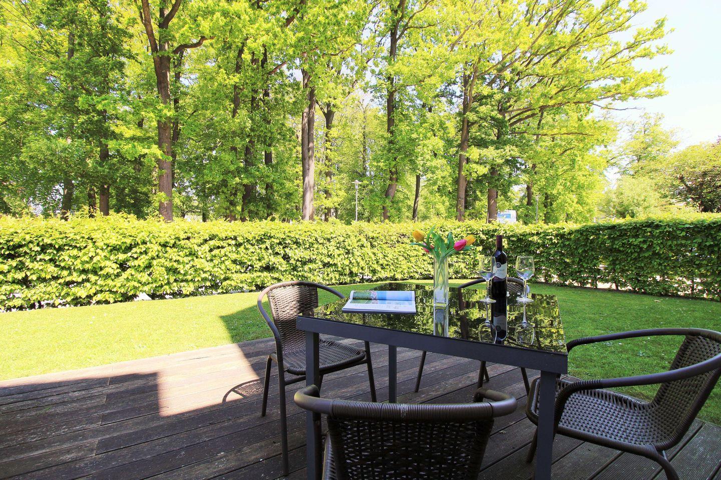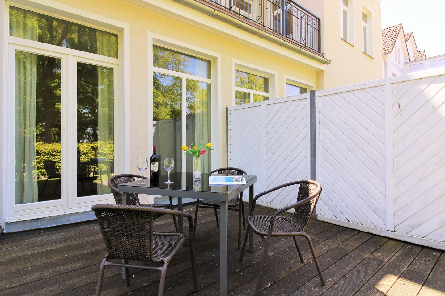 Die Wohnung verfügt über eine ebenerdige, zur Ostsee und zum direkt gegenüber liegenden „Baltic-Park“ ausgerichtete, ca. 14 m² große, Terrasse (mit Tisch und Stühlen möbliert), die Sie von der Küche aus erreichen. Hier sitzen Sie entspannt und gemütlich im Grünen und können abends bei einem guten Glas Wein in Ruhe die lauen Sommernächte genießen!