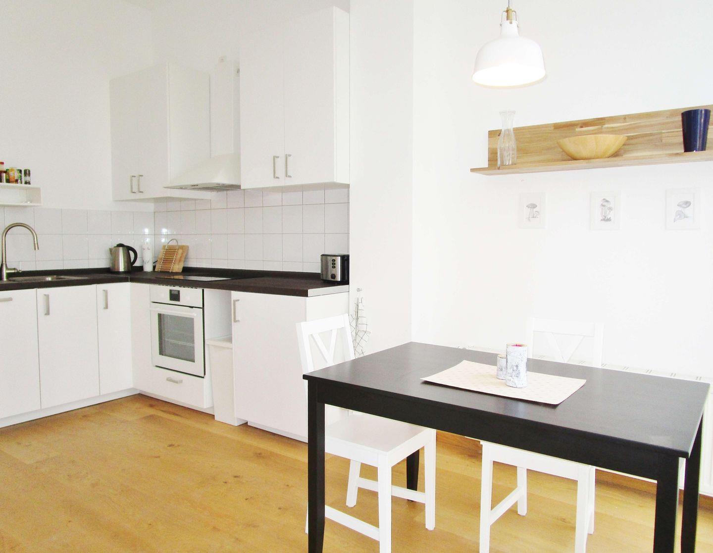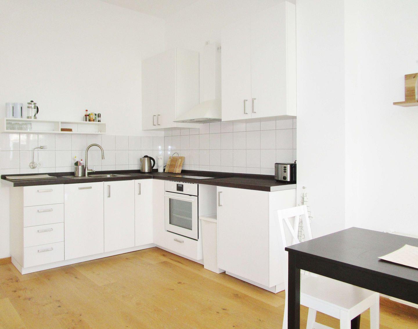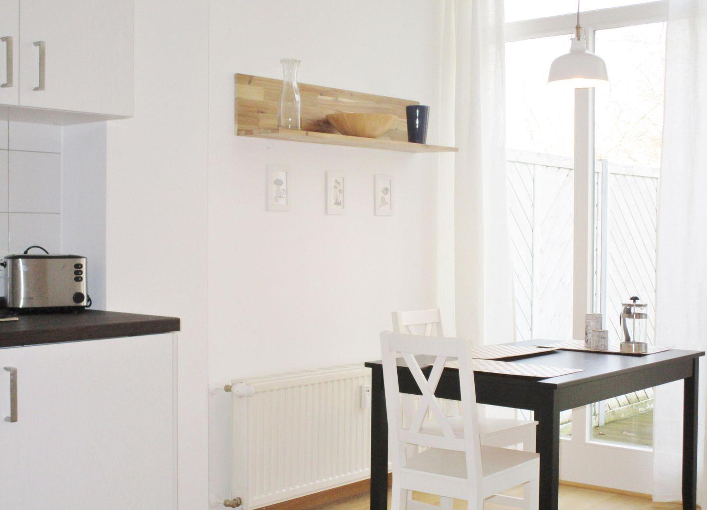 Die separate Küche beinhaltet eine voll ausgestattete Einbauküchenzeile mit 4-Platten-Ceran-Kochfeld, Backofen, Dunstabzug, Kühlschrank mit Gefrierfach, Geschirrspülmaschine, Kaffeemaschine, Wasserkocher und Toaster. Die Küche ist mit Geschirr, Gläsern, Besteck und Töpfen bestens und vollständig ausgestattet. Weiterhin gibt es in der Küche einen separaten Essbereich mit Esstisch und Stühlen.