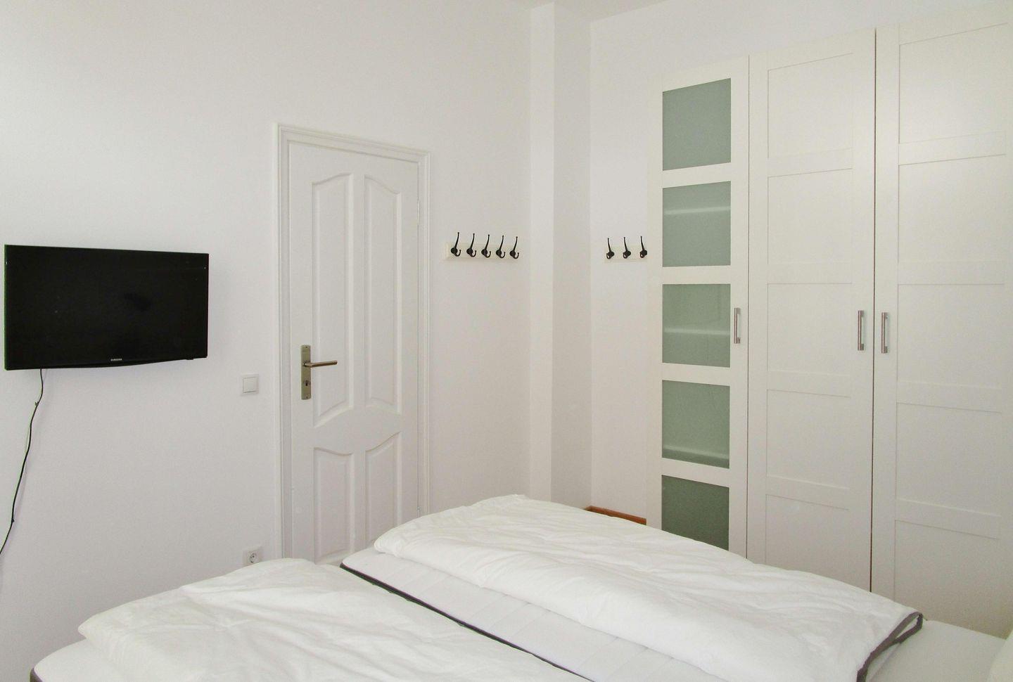 Das freundliche und helle Schlafzimmer ist mit einem bequemen Doppelbett (2x90x200) sowie einem geräumigen Kleiderschrank eingerichtet. Darüber hinaus steht Ihnen hier ein 2. modernes TV-Gerät zur Verfügung. Eine zusätzliche bequeme Schlafmöglichkeit für eine weitere 3. Person bietet die ausziehbare Schlafcouch im Wohnzimmer.