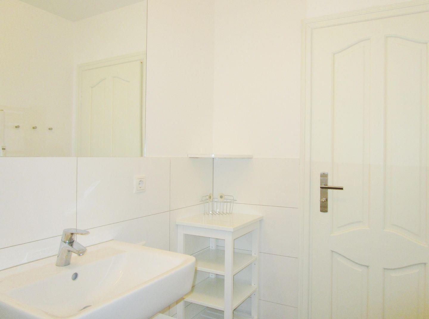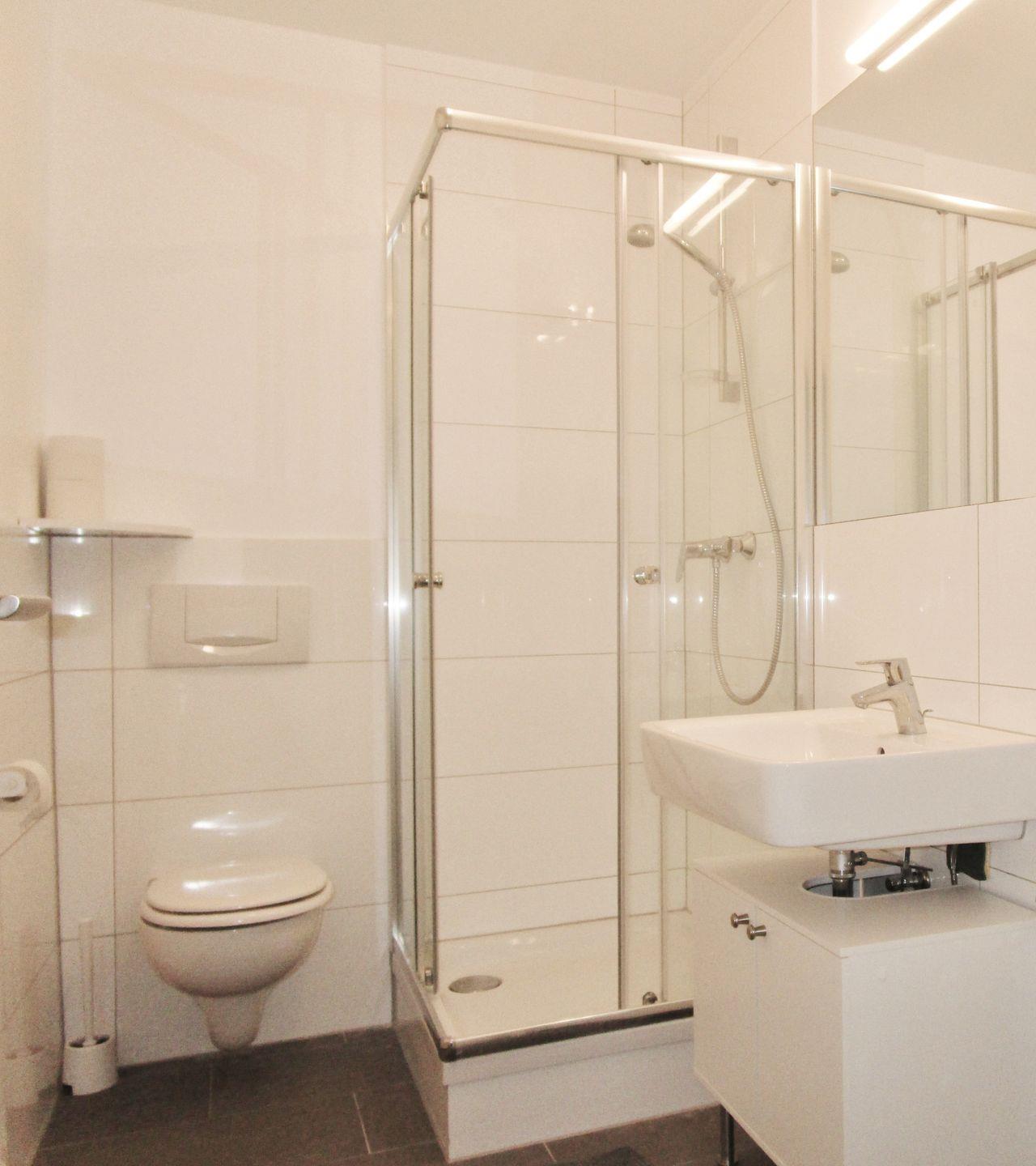 Das moderne und geräumige Badezimmer verfügt über eine Dusche mit Echtglas-Abtrennung, Waschbecken mit Unterschrank, WC sowie ein Regal für Ihre Badezimmerutensilien.