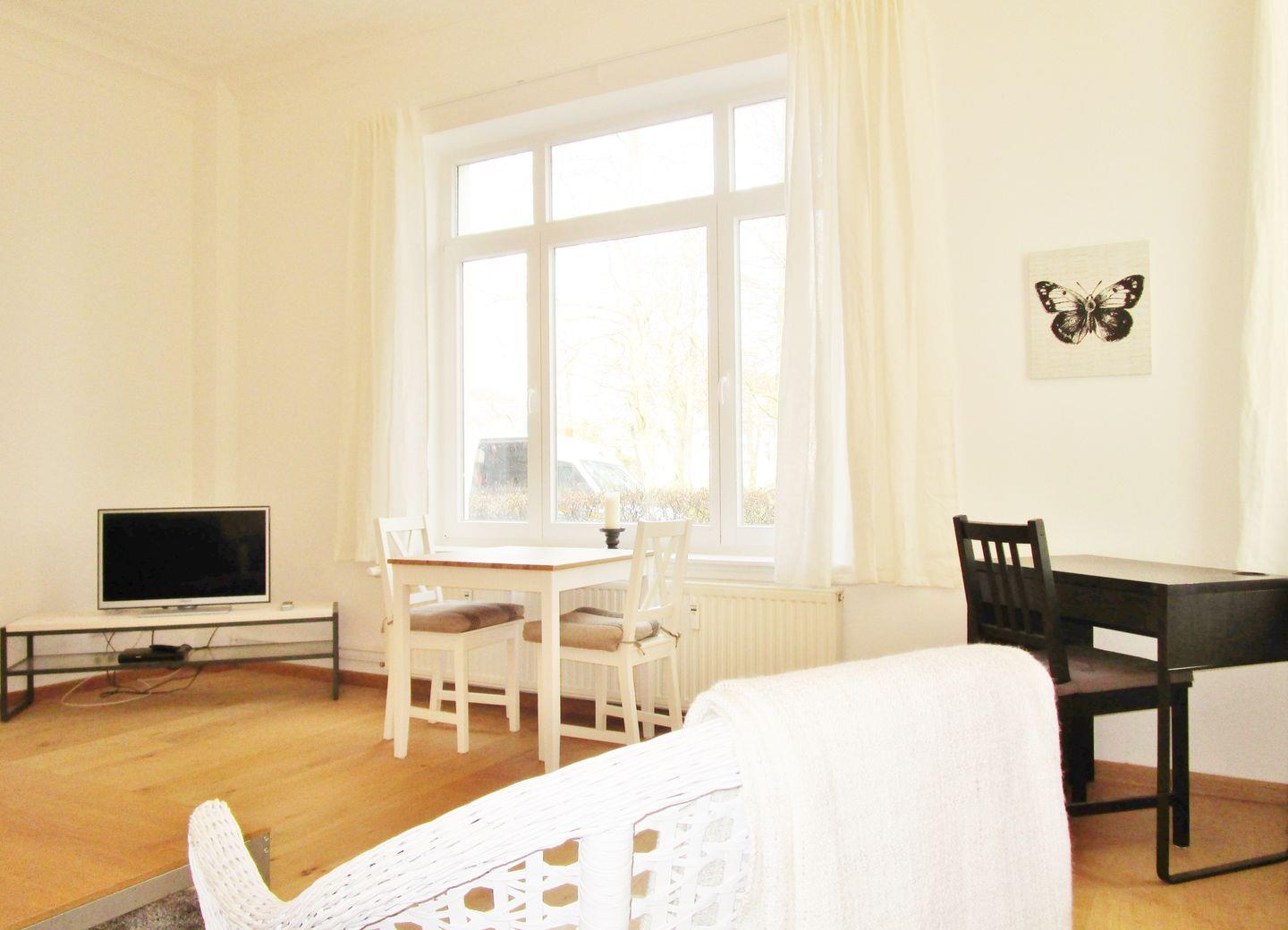 Die strandnahe, moderne und lichtdurchflutete 2-Zimmer-Wohnung (ca. 64 m²) im Erdgeschoss besitzt ein hohes Maß an Funktionalität und ist komplett eingerichtet. Alle Fußböden des Wohnbereiches sind Holzparkett, das Bad / WC ist gefliest.