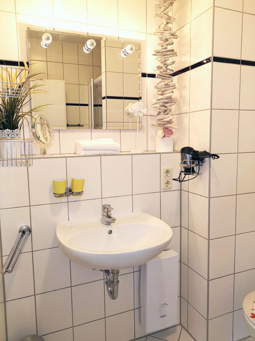 Das Badezimmer verfügt über eine Dusche, Waschbecken und WC, einen Föhn sowie ausreichend Ablagemöglichkeiten.