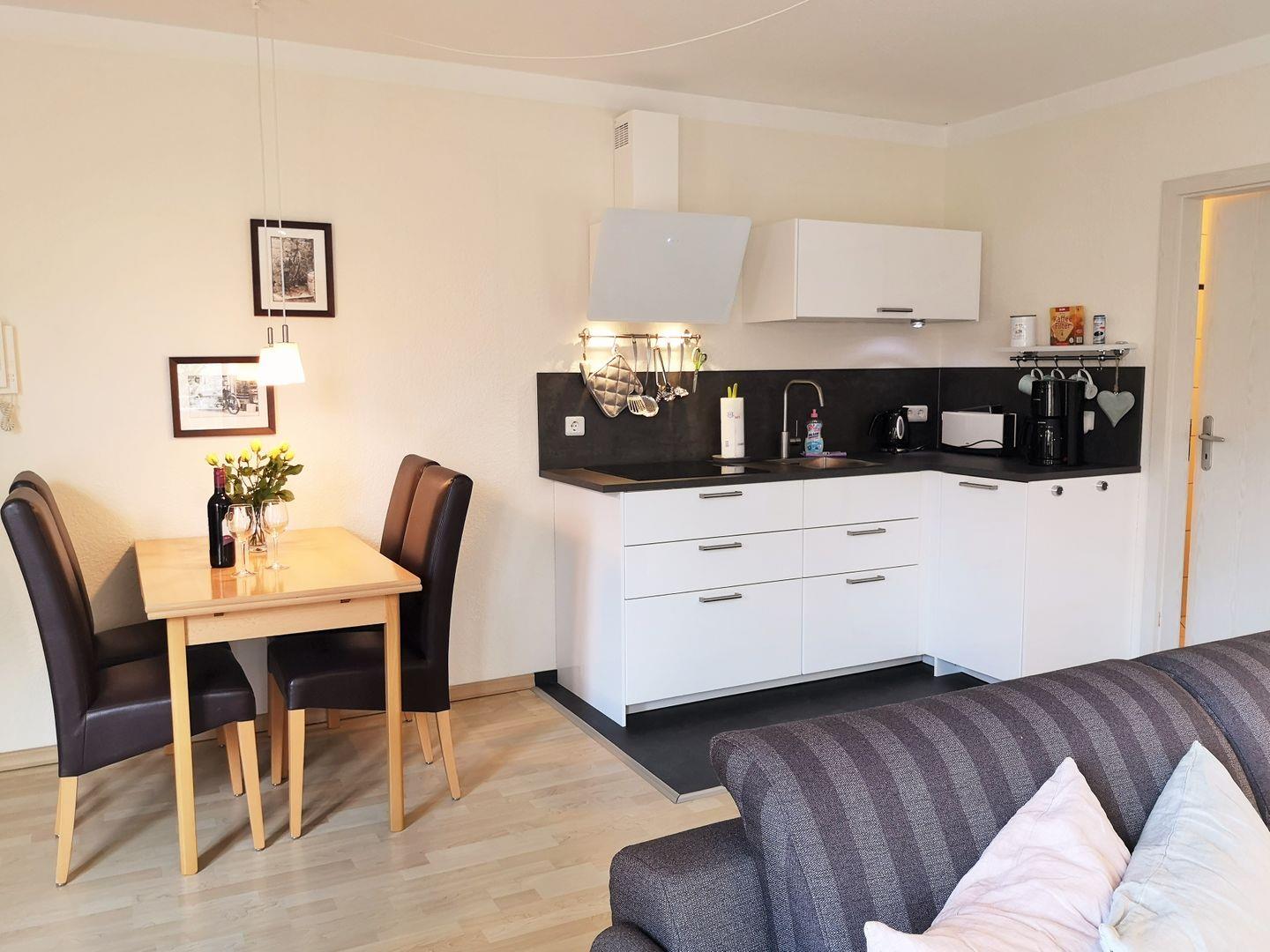 Die offene Küche beinhaltet eine voll ausgestattete Einbauküchenzeile mit 4-Platten-Ceran-Kochfeld, Dunstabzug, Backofen, Kühlschrank mit Gefrierfach, Kaffeemaschine, Wasserkocher und Toaster. Die Küche ist mit Geschirr, Gläsern, Besteck und Töpfen bestens und ausreichend ausgestattet.