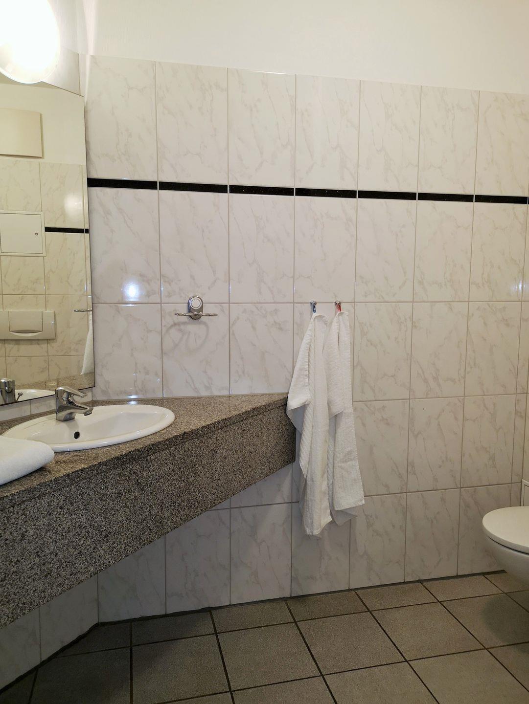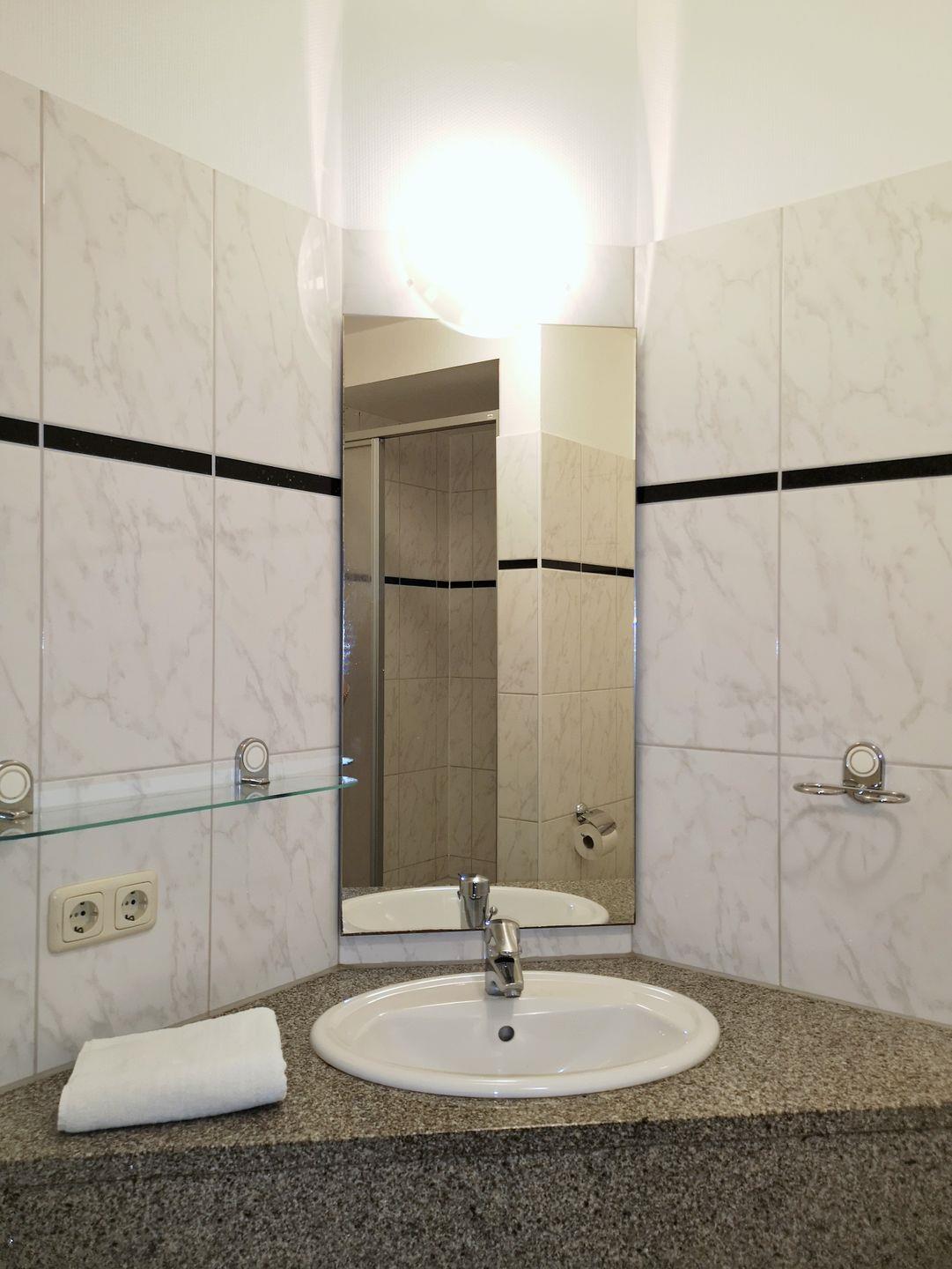 Das moderne und geräumige Badezimmer verfügt über eine Dusche, Waschbecken, WC sowie ausreichend Ablagemöglichkeiten.