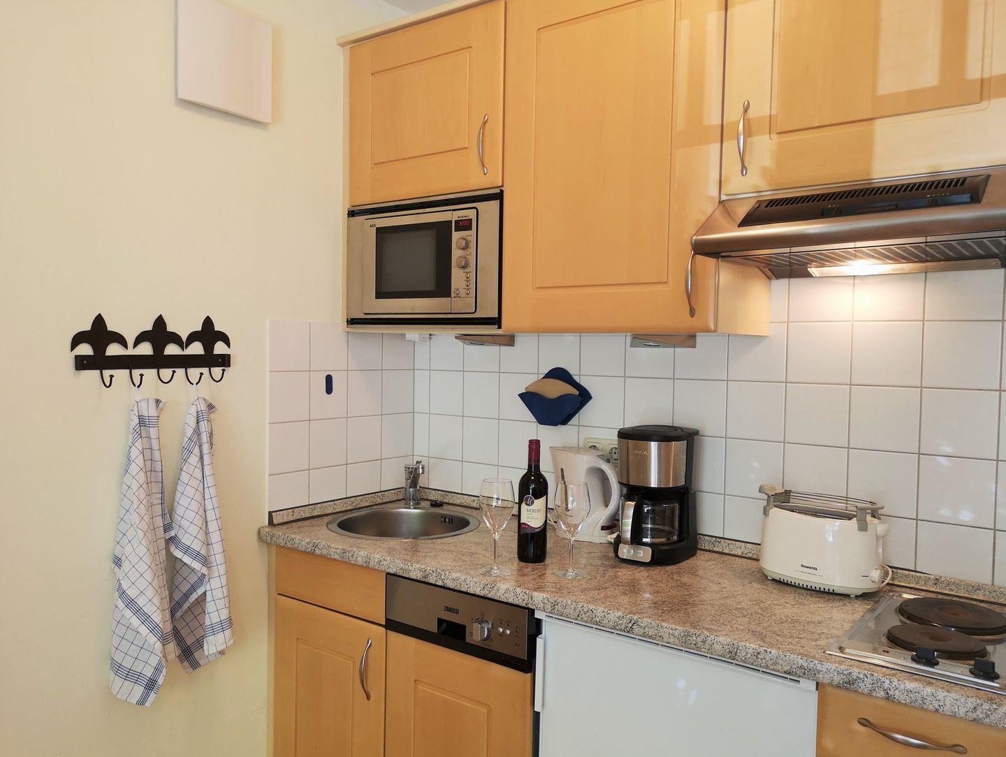 Die offene Küche beinhaltet eine voll ausgestattete Einbauküchenzeile mit 2-Platten-Elektro-Herd, Mikrowelle, Dunstabzug, Kühlschrank mit Gefrierfach, Geschirrspülmaschine, Kaffeemaschine, Wasserkocher sowie Toaster und ist mit Geschirr, Gläsern, Besteck und Töpfen bestens und ausreichend ausgestattet.