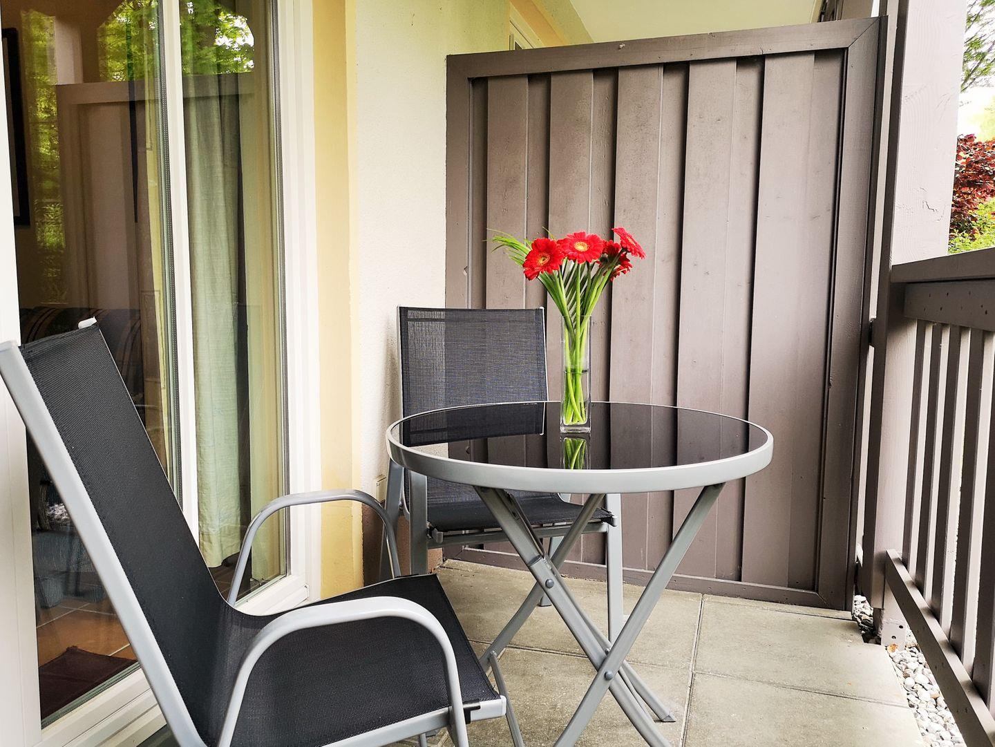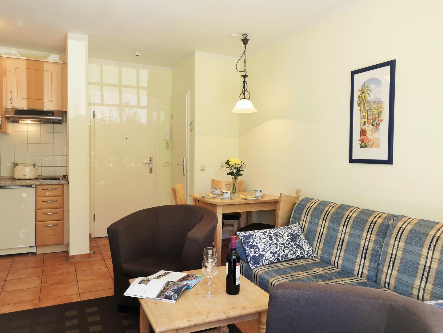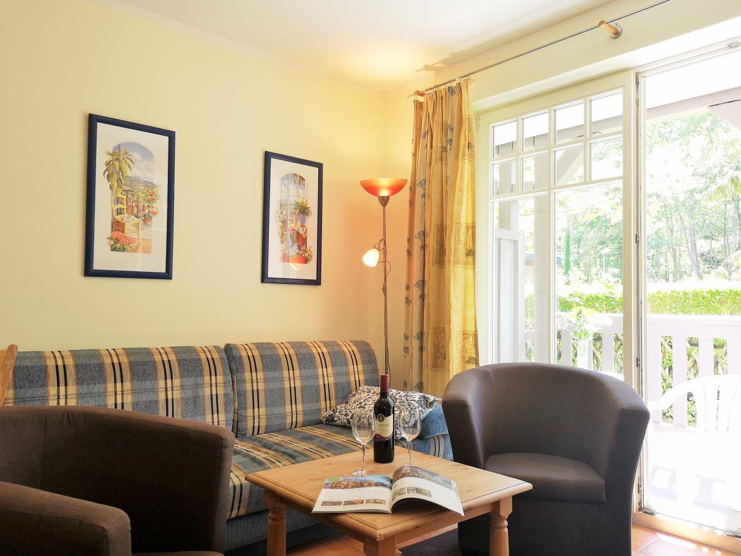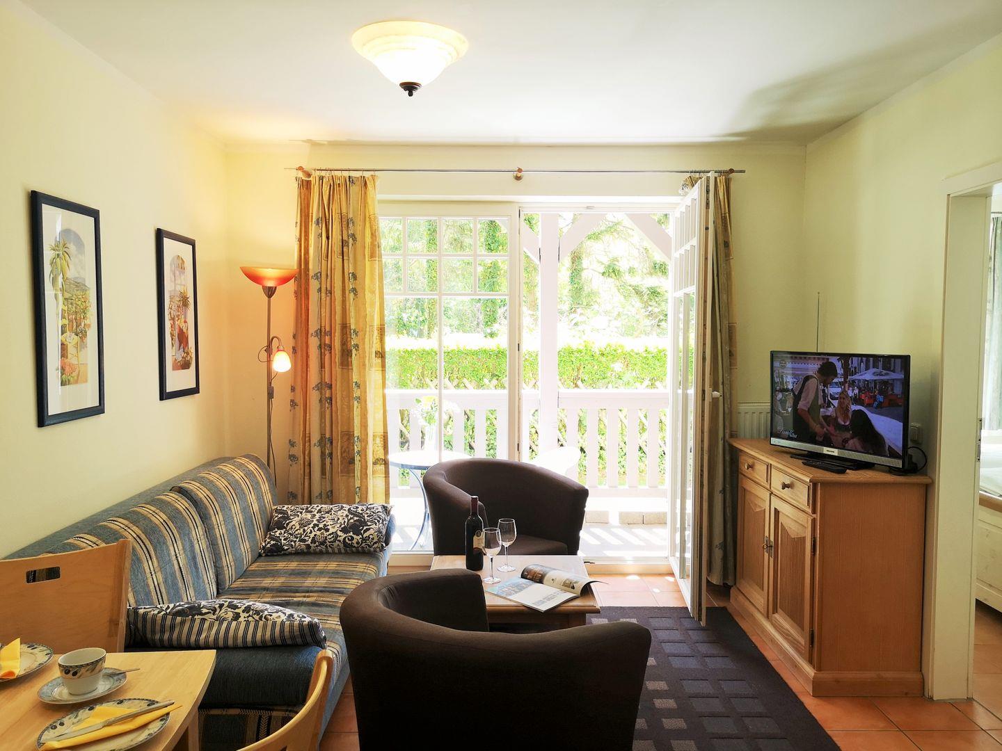 Das gemütliche Wohn-/Esszimmer verfügt über eine separate Sitzgruppe mit bequemer Couch, 2 Sesseln und Couchtisch, einen separaten kleinen Esstisch mit 3 Stühlen sowie ein Sideboard. Vom Wohnzimmer aus haben Sie direkten Zugang zu dem sonnigen und ebenerdigen Balkon (nach Süden und zum Wald ausgerichtet) mit Balkonmöbeln - hier sitzen Sie entspannt und gemütlich mitten im Grünen und können abends bei einer guten Flasche Wein die lauen Sommernächte genießen …!