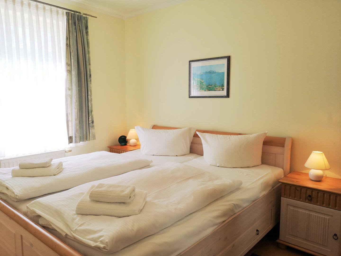 Das freundliche und gemütliche Schlafzimmer ist mit einem bequemen Doppelbett, Nachttischen sowie einem geräumigen Kleiderschrank eingerichtet. Eine zusätzliche bequeme Schlafmöglichkeit für eine weitere 3. Person bietet die ausziehbare Schlafcouch im Wohnzimmer.