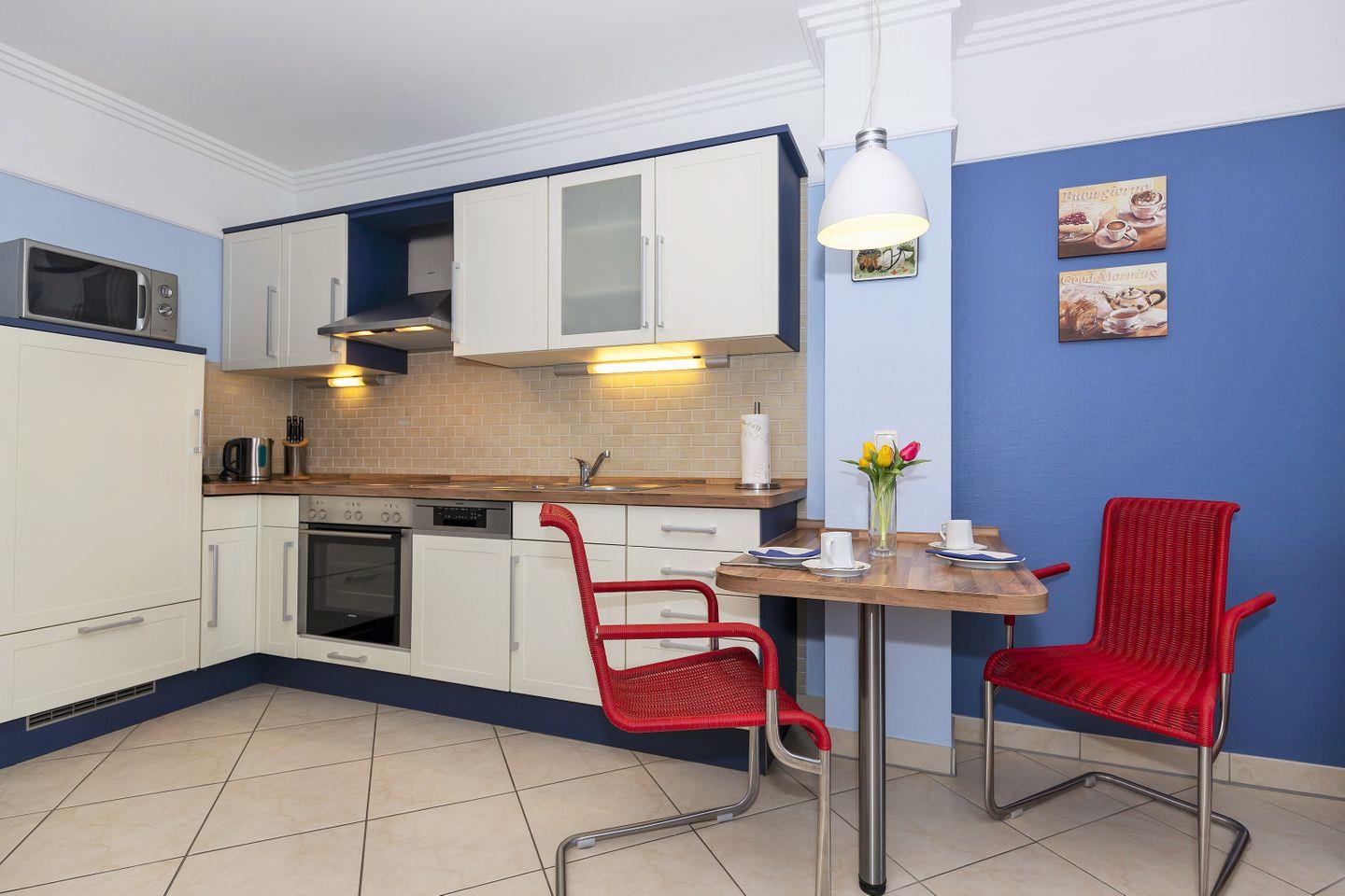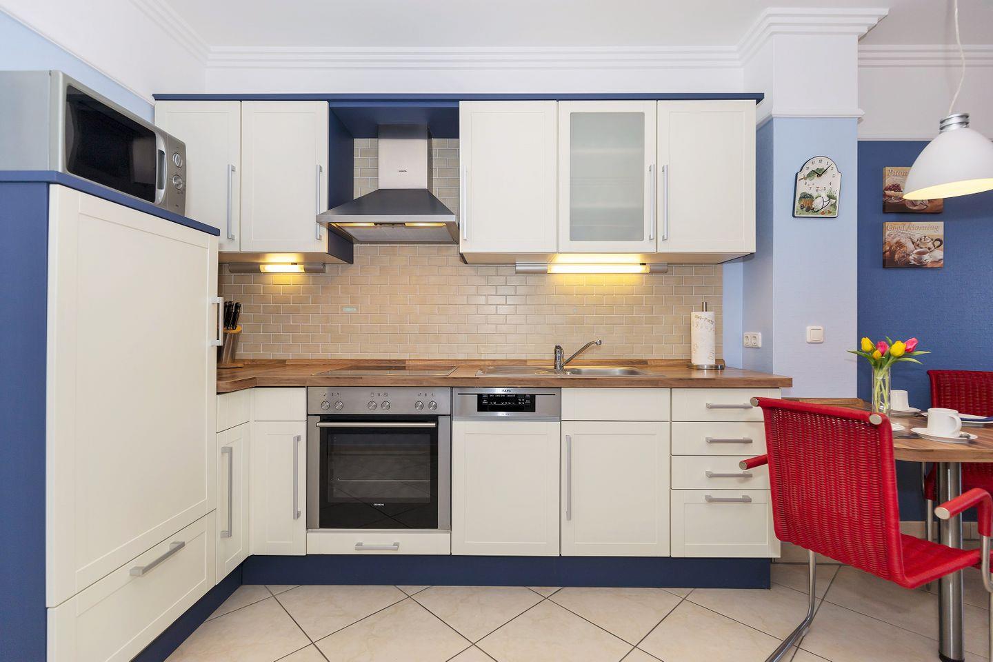 Die offene Küche beinhaltet eine voll ausgestattete Einbauküchenzeile in gehobener Ausstattung mit 4-Platten-Ceran-Kochfeld, Backofen, Dunstabzug, Mikrowelle, Kühlschrank mit Gefrierfach, Geschirrspülmaschine, Kaffeemaschine, Wasserkocher und Toaster. Die Küche ist mit Geschirr, Gläsern, Besteck und Töpfen bestens und ausreichend ausgestattet.