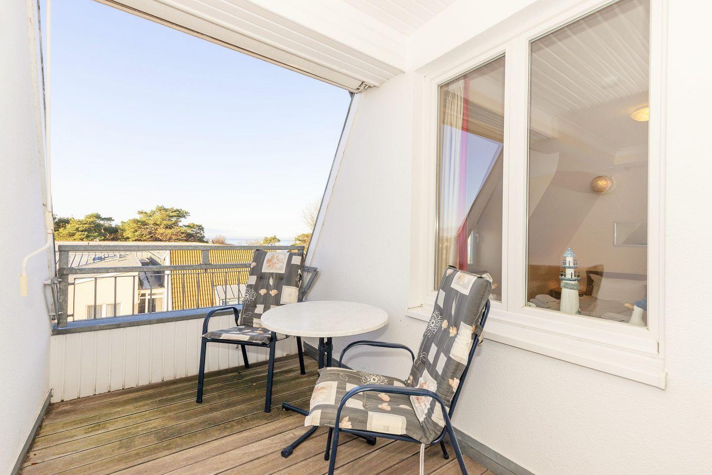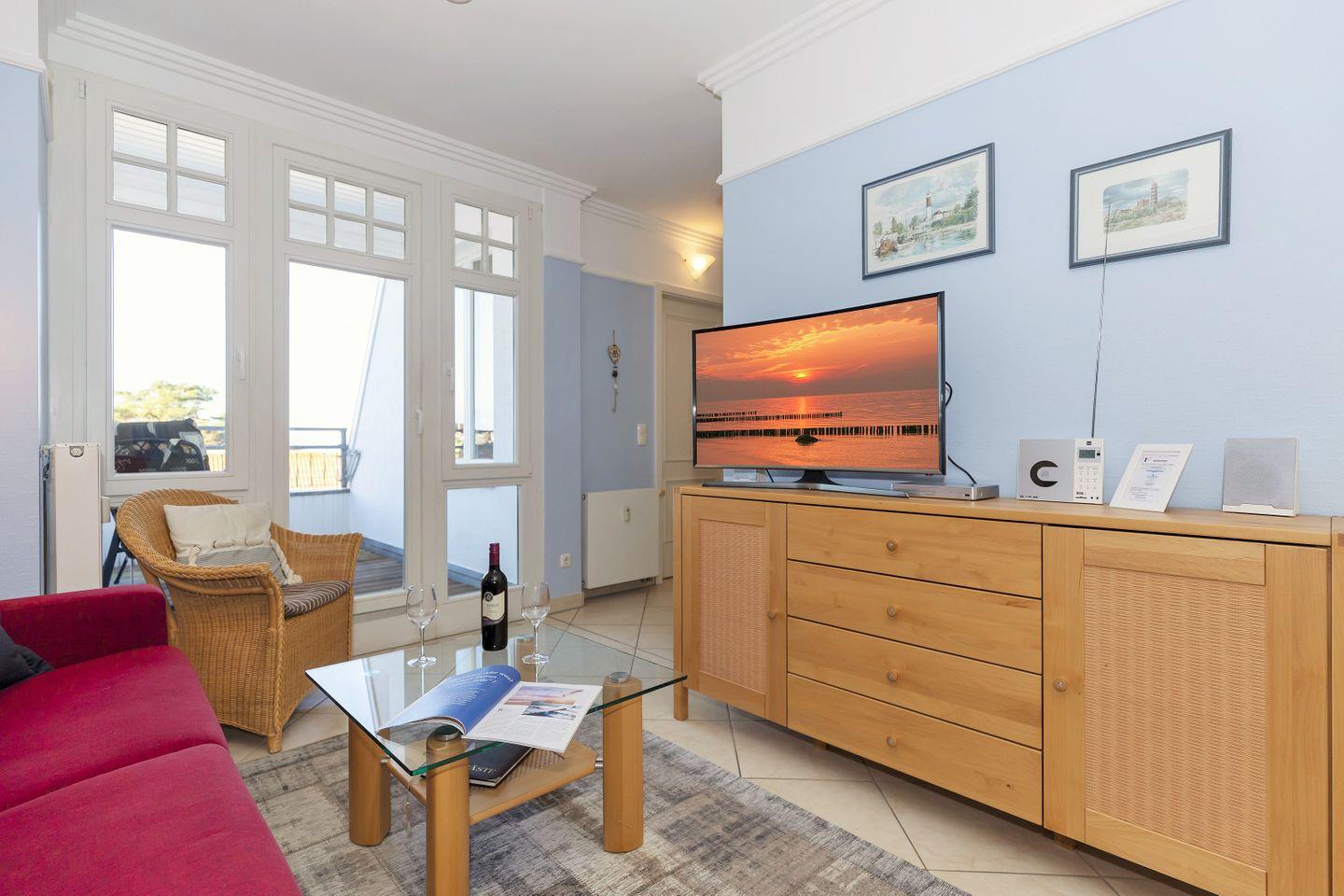 Das freundliche und sehr gemütliche Wohn-/Esszimmer verfügt über eine separate Sitzgruppe mit bequemer Couch, Sessel und Couchtisch, einen separaten Esstisch mit Stühlen sowie ein Sideboard. Vom Wohnzimmer aus haben Sie direkten Zugang zu der sonnigen und teilweise überdachten Dachterrasse (nach Westen ausgerichtet) mit Balkonmöbeln. Hier sitzen Sie entspannt und gemütlich mit einem wunderschönen Blick auf die Ostsee sowie über die Dächer von Kühlungsborn und können abends bei einem guten Glas Wein in Ruhe die lauen Sommernächte genießen!