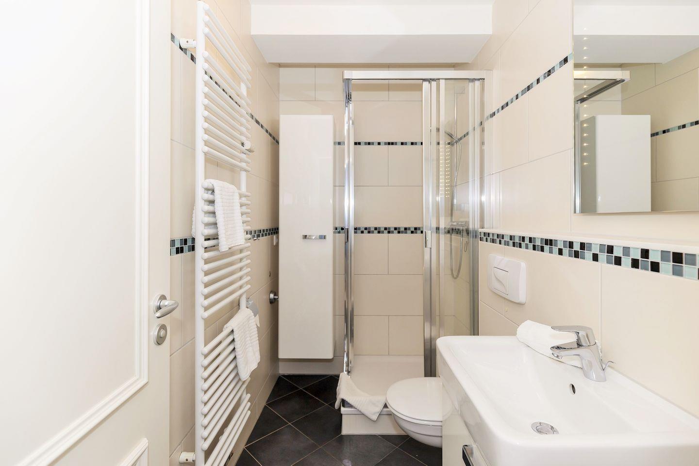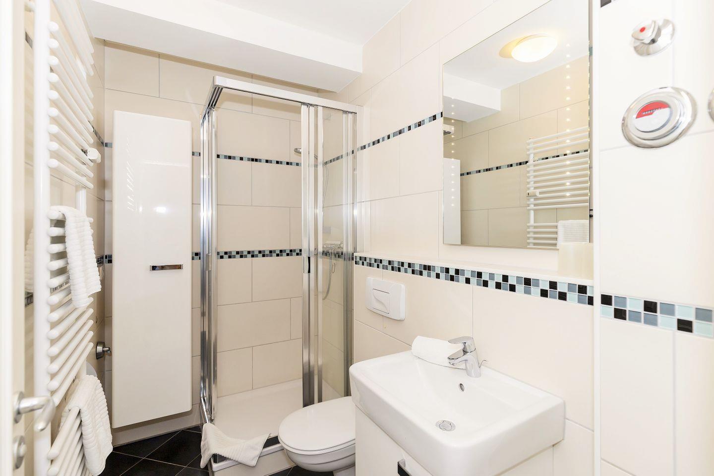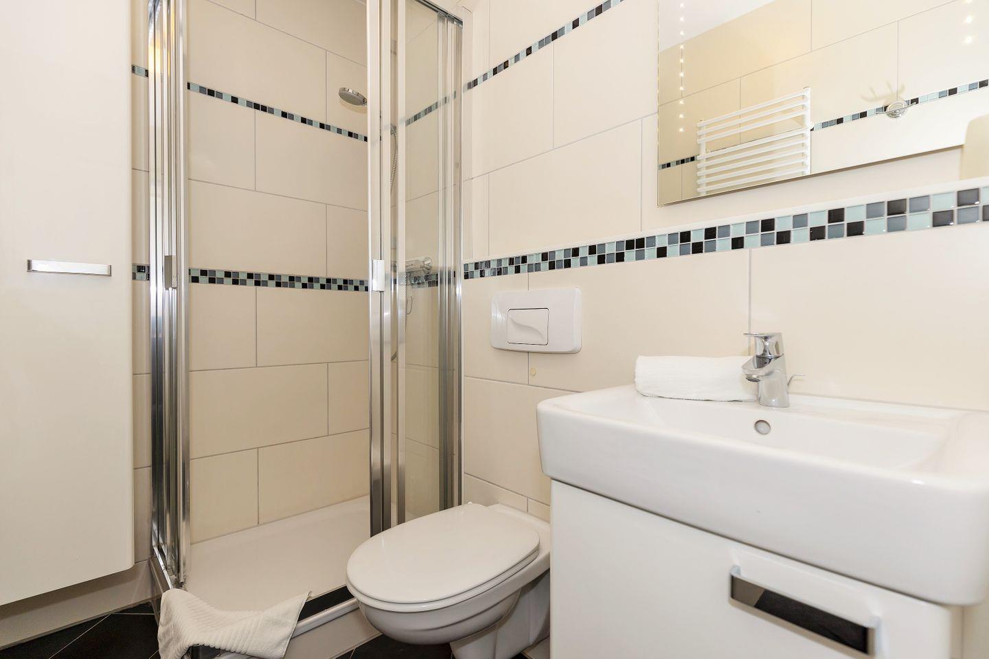 Das moderne und elegante Badezimmer verfügt über eine Dusche, Waschbecken mit Unterschrank, WC, einen geräumigen Badezimmerschrank, Föhn, Handtuch-Heizkörper sowie ausreichend Ablagemöglichkeiten.