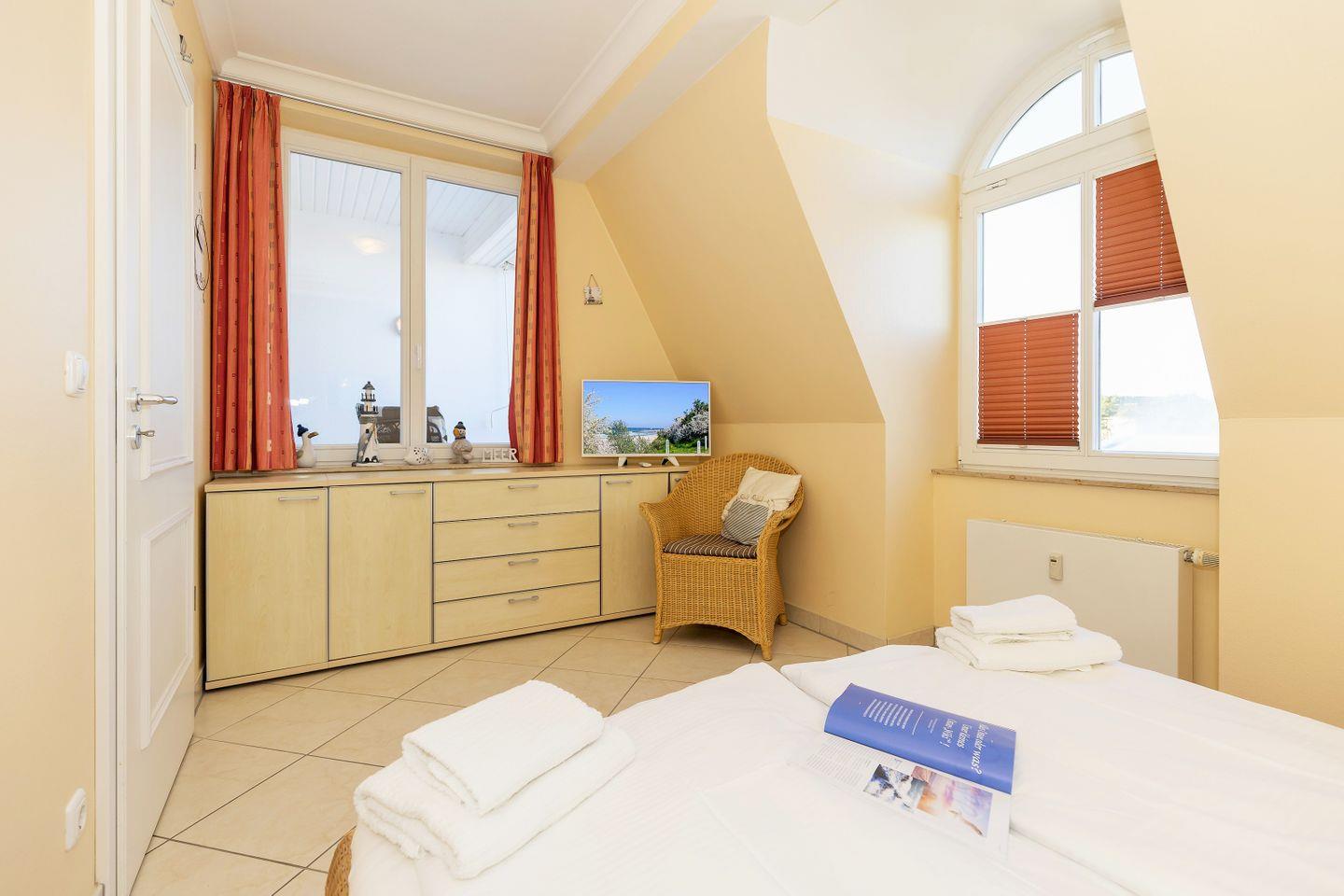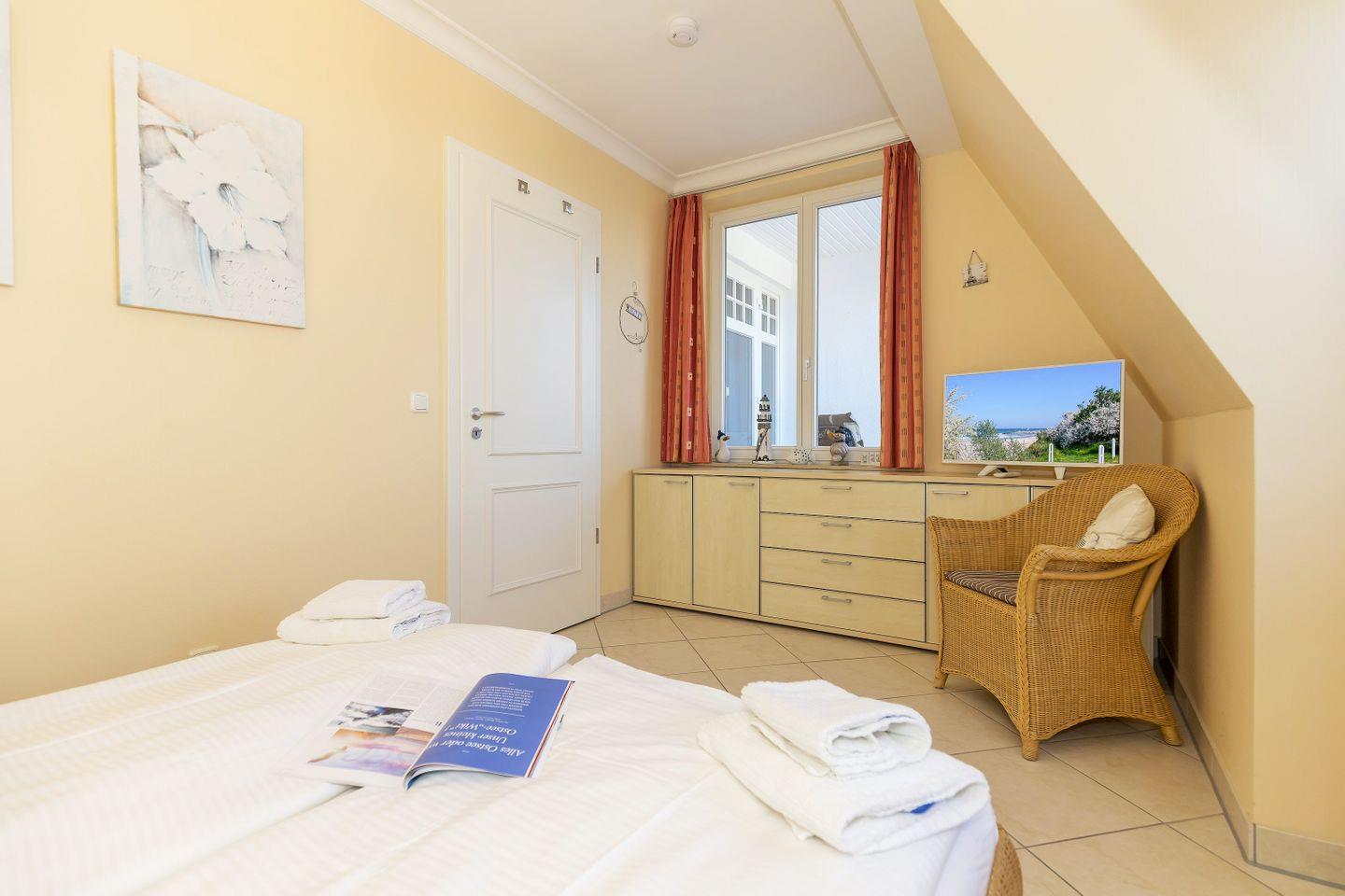 Das helle und gemütliche Schlafzimmer ist mit einem bequemen Doppelbett, Nachttischen, einem geräumigen Kleiderschrank (im Flur), einer großen Wäschekommode sowie einem Sessel eingerichtet. Hier steht Ihnen ein weiteres modernes Flachbildschirm-TV-Gerät zur Verfügung.