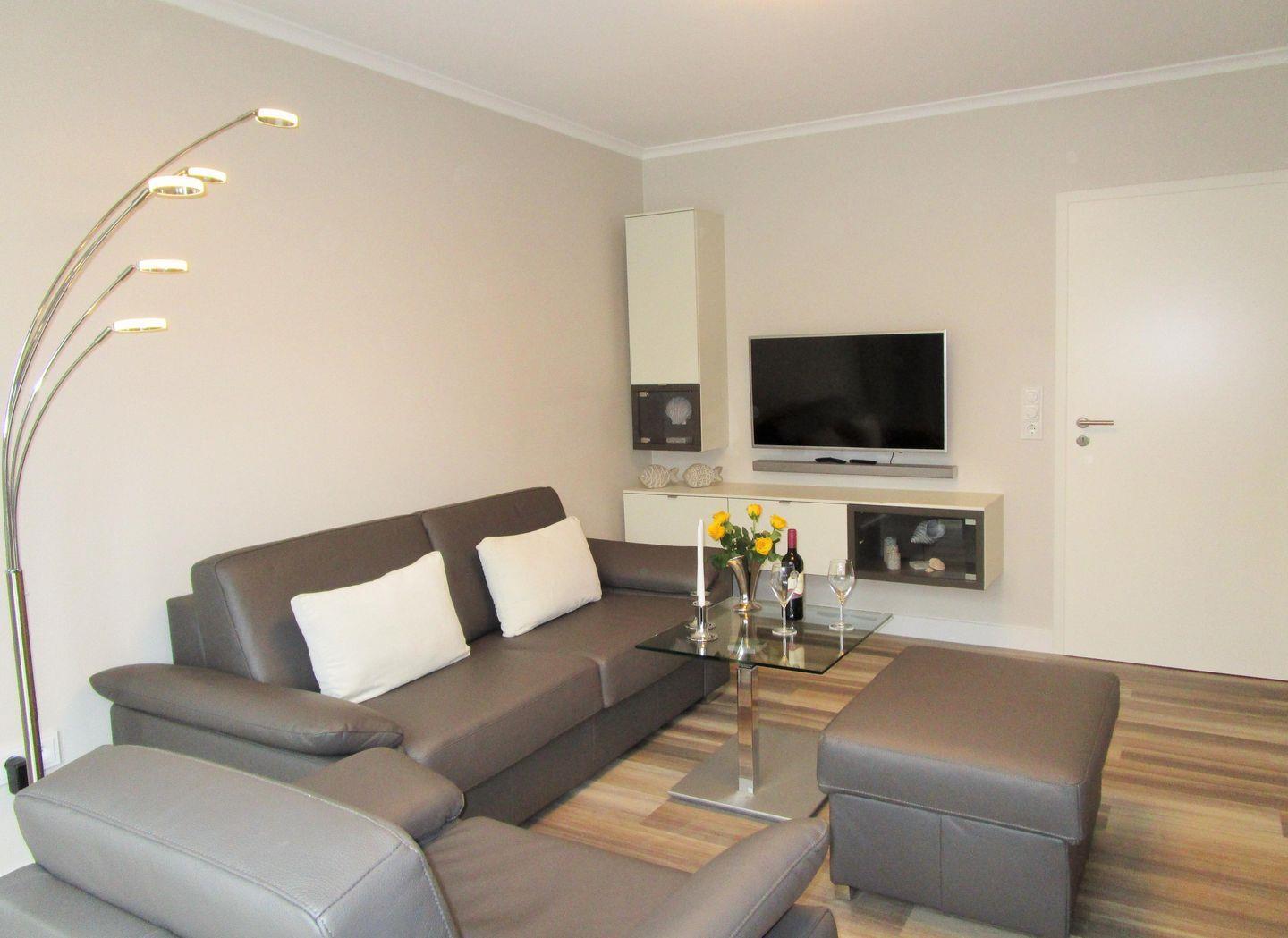 Zu Ihrer Unterhaltung stehen Ihnen im Wohnbereich der Ferienwohnung ein modernes und großes Flachbildschirm-TV-Gerät, Internetradio sowie ein Multi-Funktionslautsprecher (mit USB-Anschluss, Möglichkeit der Musikübertragung von Ihrem Handy, u.ä.) mit Sound-Bar zur Verfügung. Im 1. Schlafzimmer befindet sich ebenfalls ein Flachbildschirm-TV-Gerät. Darüber hinaus verfügt die Wohnung über kostenfreies WLAN.