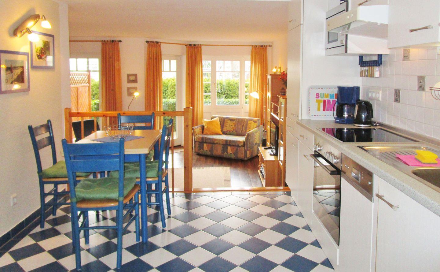 Der offene Küchen- und Essbereich mit einem separaten Esstisch und 4 Stühlen beinhaltet eine voll ausgestattete Einbauküchenzeile mit 4-Zonen-Ceran-Kochfeld, Backofen, Dunstabzug, Mikrowelle, Kühlschrank mit Gefrierfach, Geschirrspülmaschine, Kaffeemaschine, Wasserkocher und Toaster. Die Küche ist mit Geschirr, Gläsern, Besteck und Töpfen bestens und ausreichend ausgestattet.