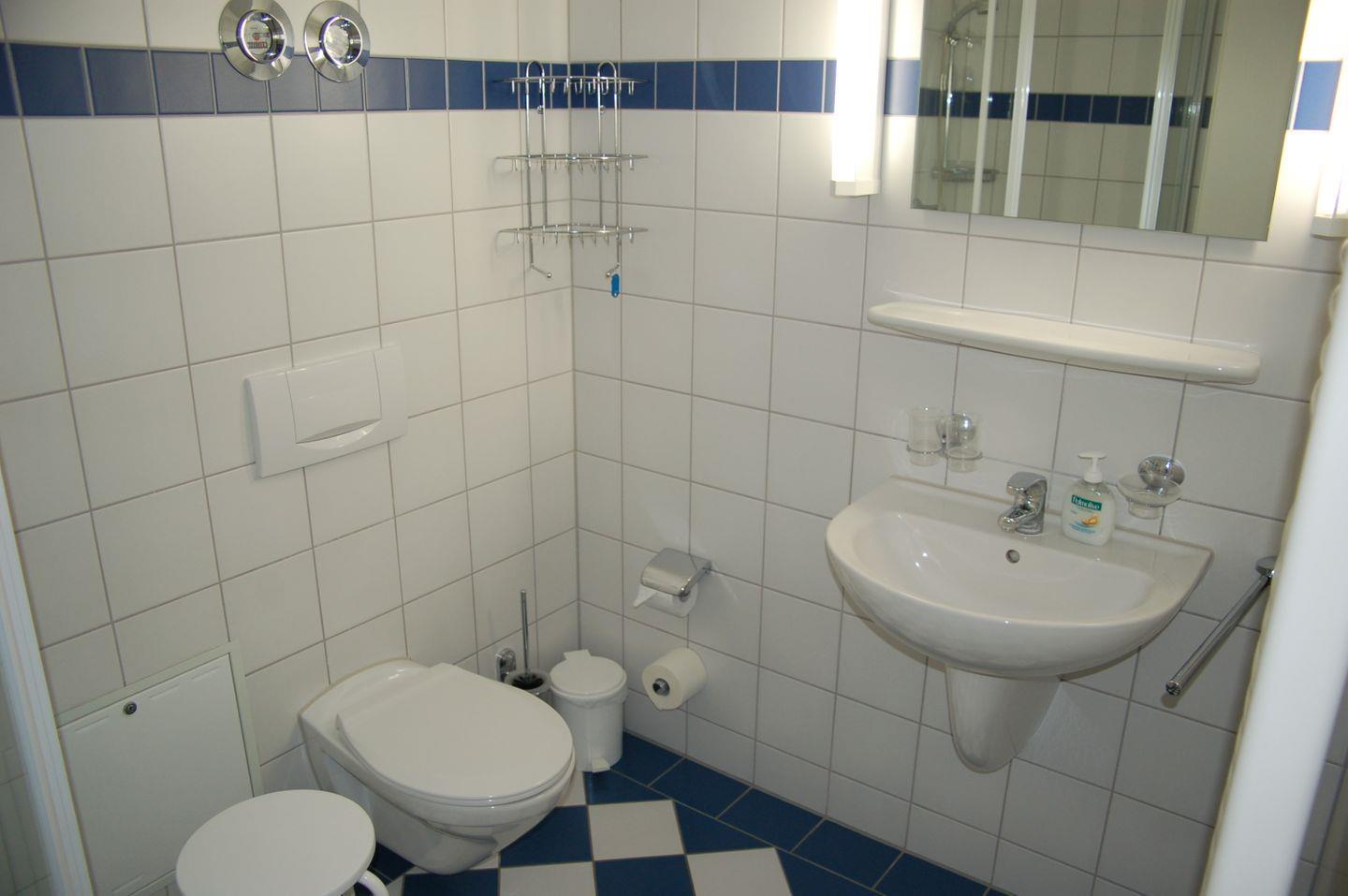 Das freundliche Badezimmer verfügt über eine Dusche, Waschbecken, WC und Handtuch-Heizkörper sowie ausreichend Ablagemöglichkeiten.