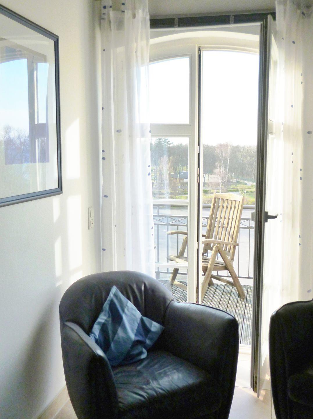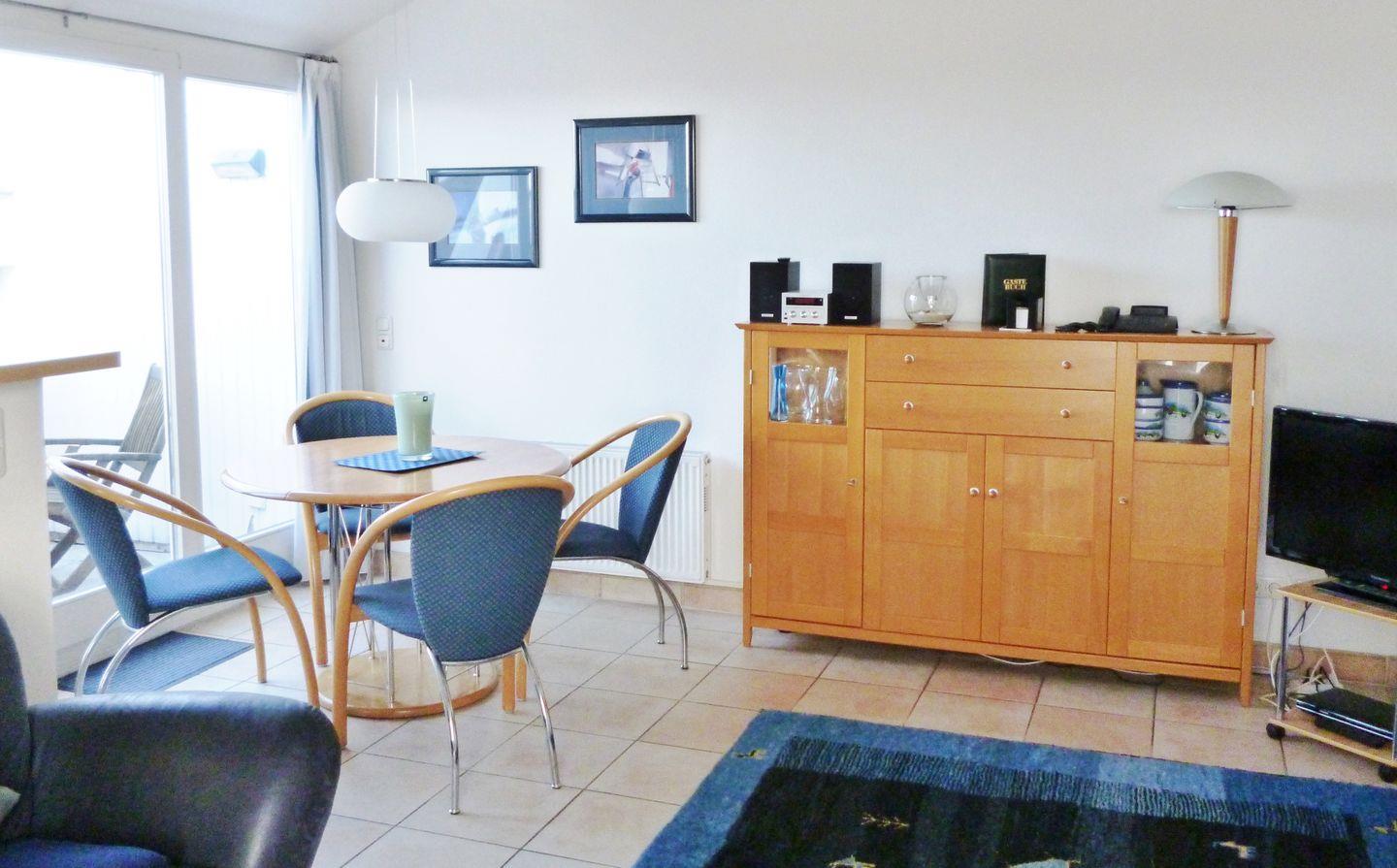 Das freundliche, geräumige und sehr gemütliche Wohn-/Esszimmer verfügt über eine separate Sitzgruppe mit bequemer Couch, 2 Sesseln und Couchtisch, einen separaten Esstisch mit 4 Stühlen sowie 2 Schränke. Vom Wohnzimmer aus haben Sie direkten Zugang sowohl zu dem sonnigen Balkon (nach Süd-Westen ausgerichtet) wie auch zu der verglasten und schönen Loggia (nach Nord-Osten ausgerichtet), beide mit herrlichem Blick auf die nahe Ostsee. Hier sitzen Sie entspannt beim Frühstück oder können abends bei einem guten Glas Wein die lauen Sommernächte genießen …!