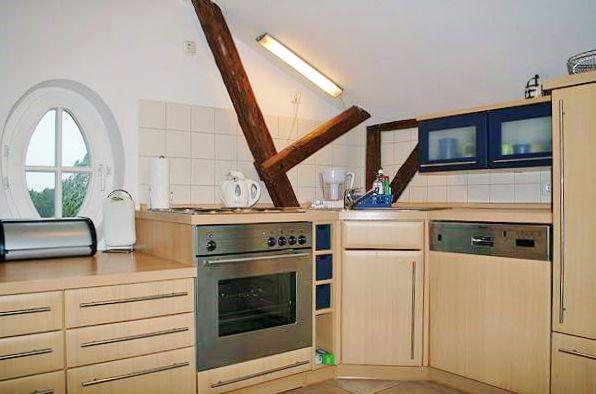 Die offene und gemütliche Küche beinhaltet eine voll ausgestattete Einbauküchenzeile mit 4-Platten-Elektroherd, Backofen, Mikrowelle, Kühlschrank mit Gefrierfach, Geschirrspülmaschine, Kaffeemaschine, Wasserkocher und Toaster. Die Küche ist mit Geschirr, Gläsern, Besteck und Töpfen bestens und ausreichend ausgestattet.