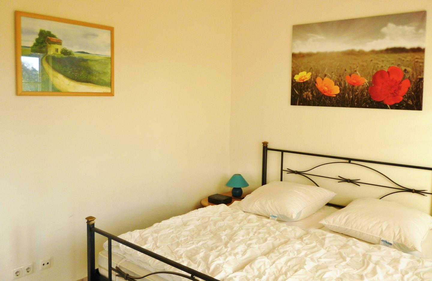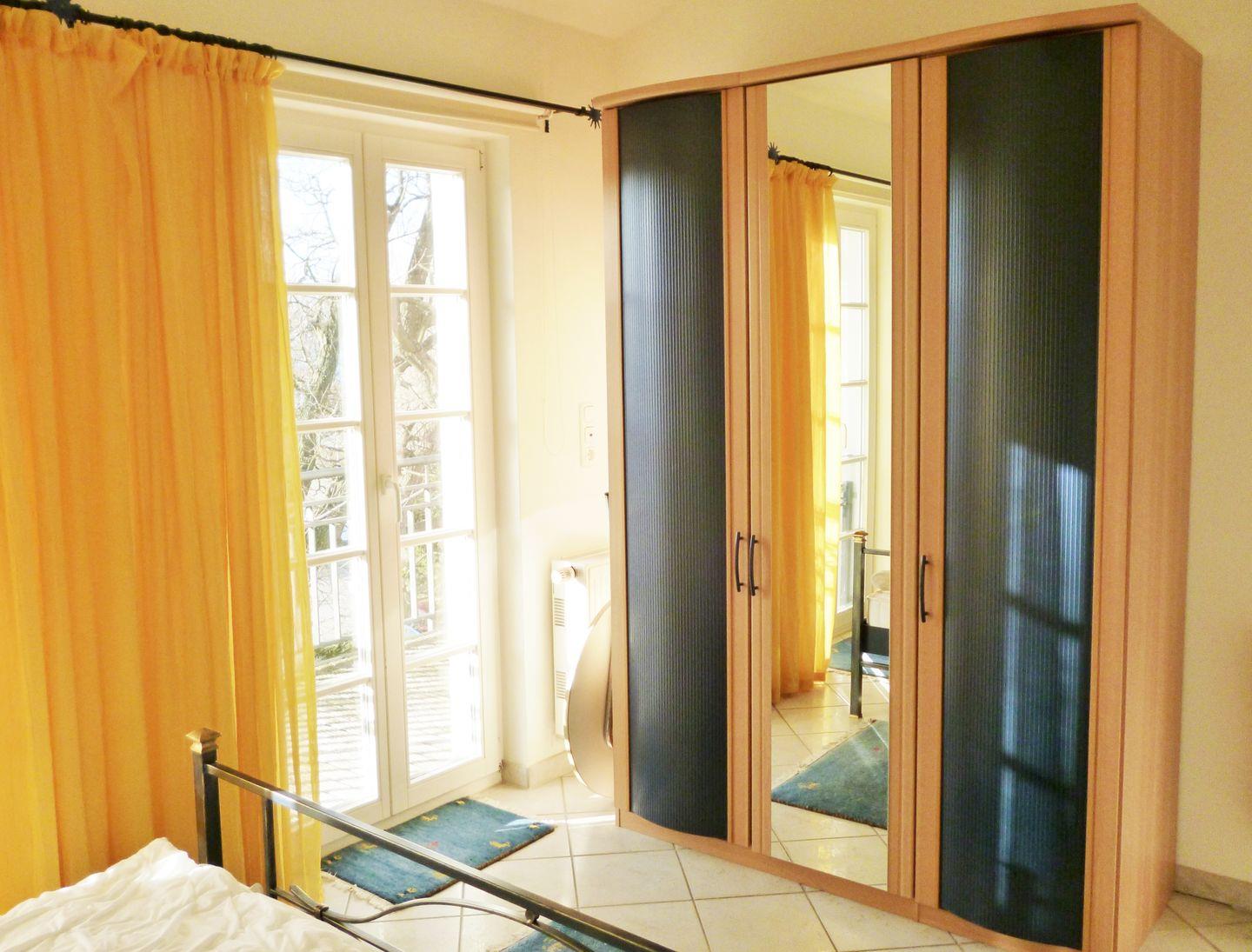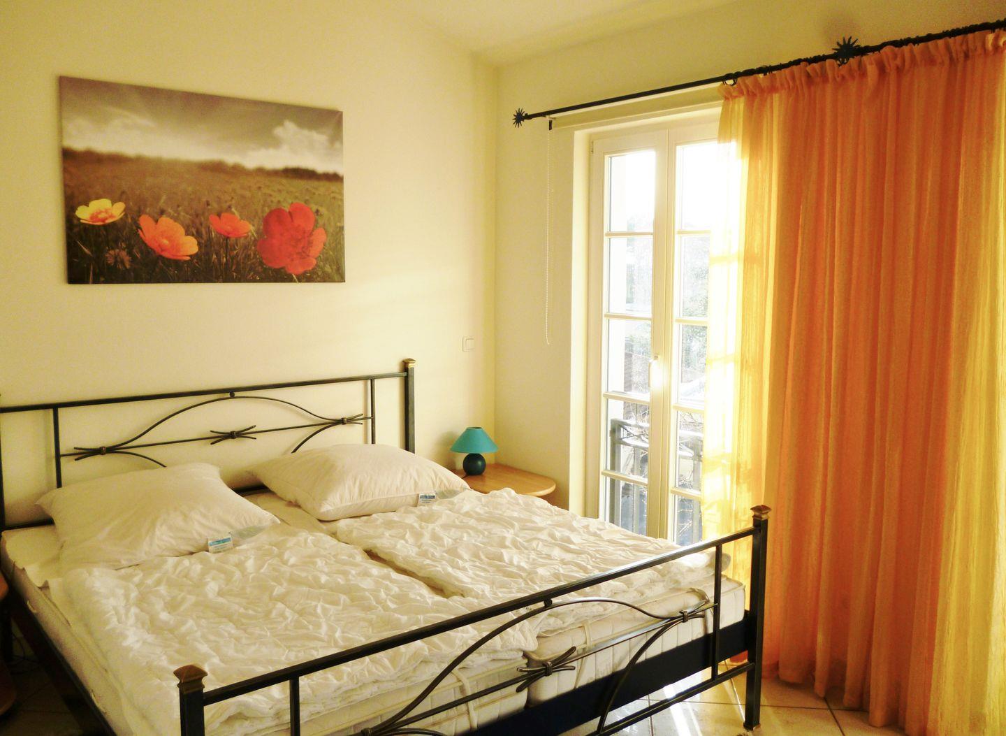 Das freundliche Schlafzimmer ist mit einem bequemen Doppelbett, Nachttischen sowie einem geräumigen Kleiderschrank eingerichtet und bietet ebenfalls Zugang zum Balkon.