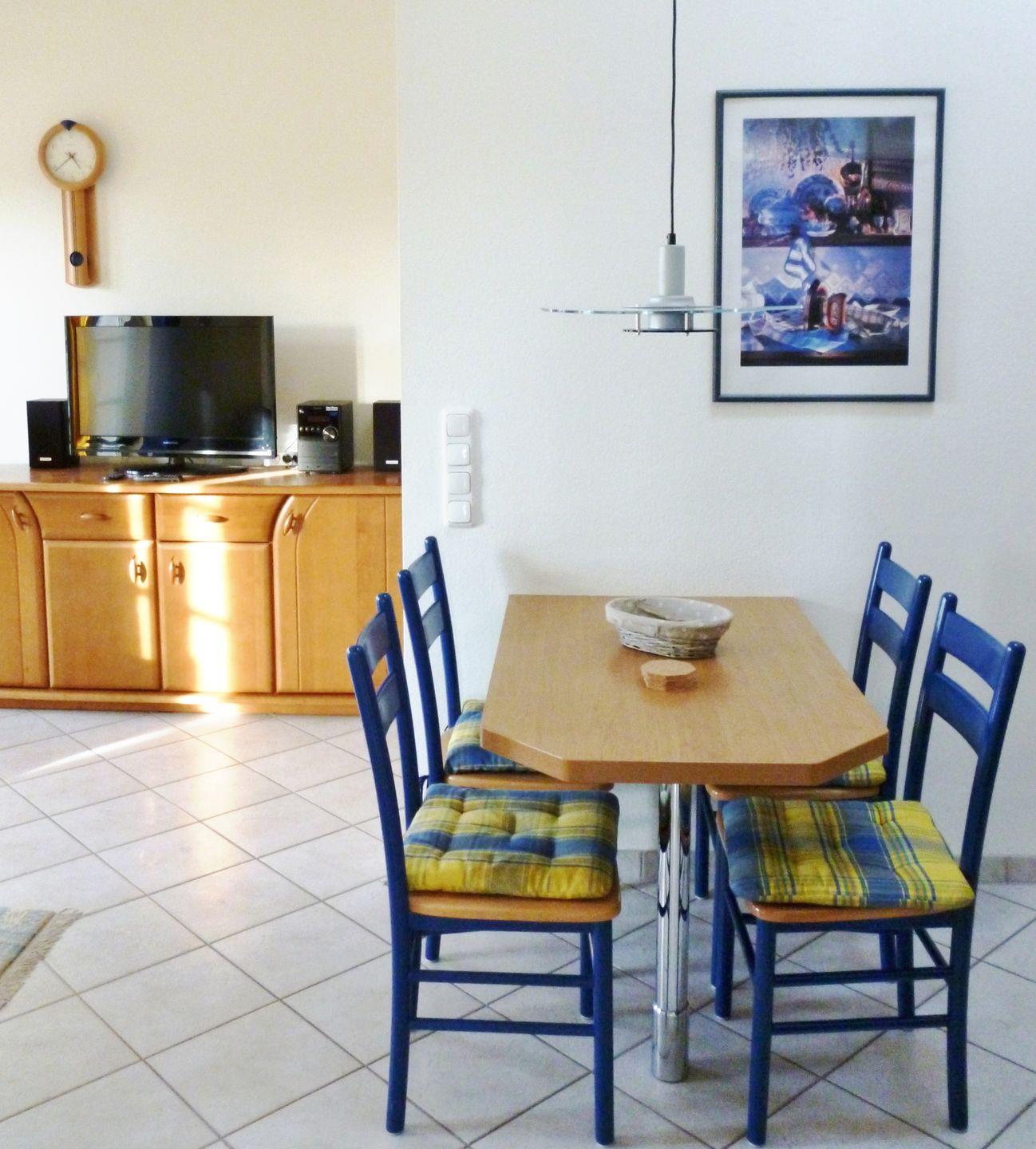 Das freundliche, geräumige und sehr gemütliche Wohn-/Esszimmer verfügt über eine separate Sitzgruppe mit bequemer Couch, Sessel und Couchtisch, einen separaten Esstisch mit 4 Stühlen sowie ein Sideboard. Vom Wohnzimmer aus haben Sie direkten Zugang zu dem nach Westen ausgerichteten Balkon mit Balkonmöbeln und seitlichem Blick auf die nahe Ostsee. Hier sitzen Sie entspannt beim Frühstück oder können abends bei einem guten Glas Wein die lauen Sommernächte genießen …!