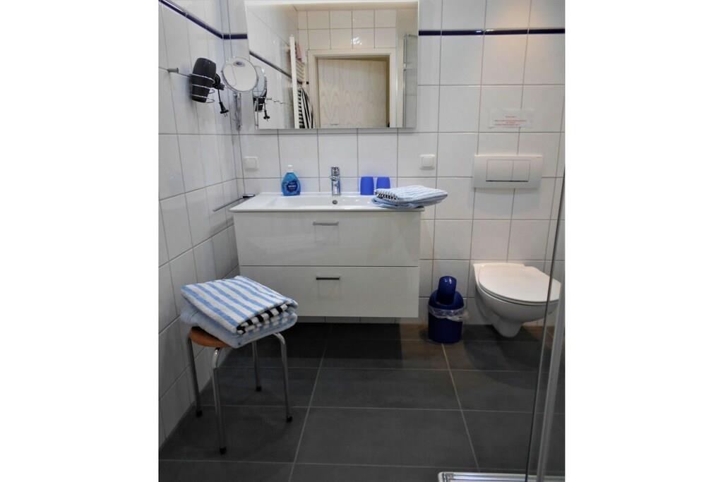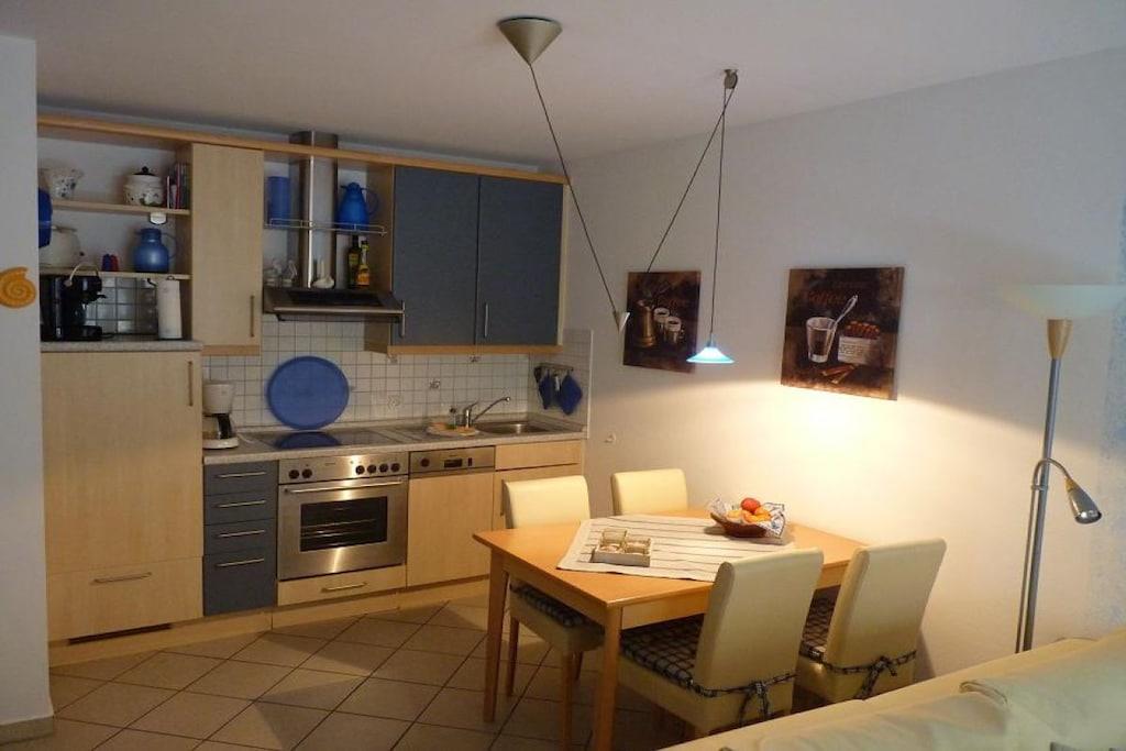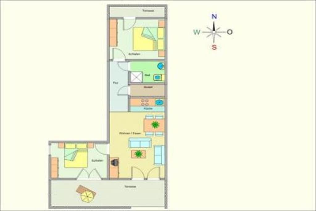 Die Ferienwohnung hat den Zugang von der Süd-West-Terrasse, auf der Sie den ganzen Tag über die Sonnen genießen können. Es empfängt Sie ein Wohnzimmer mit großem Ledersofa, ein Tisch und ein separater Sessel. Die "Unterhaltungsecke" biete Ihnen einen Fernseher mit Kabelanschluß, kleine Hifi-Anlage und DVD-Player mit kleiner Filmauswahl. Außerdem einige Spiele, Informationsmaterial zu Kühlungsborn und Umgebung und einige Bücher. An das Wohnzimmer schließen sich die Essecke und die Küchenzeile an, die sehr gut ausgestattet ist. 2 Schlafzimmer mit Doppelbett mit großen Kleiderschränken. Hinweis: ein Schlafzimmer liegt zur Straße. Bad mit Dusche, Fön, Waschbecken und WC. - Tiefgaragenplatz - Sauna im Haus gegen Gebühr - Fahrradkeller - Waschmaschine u. Trockner gegen Gebühr