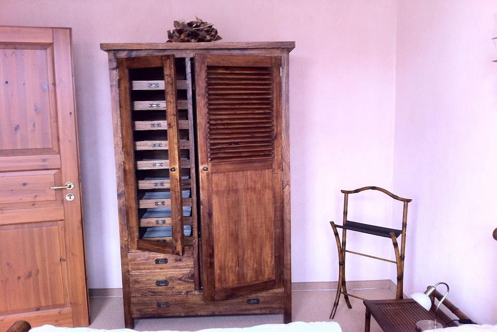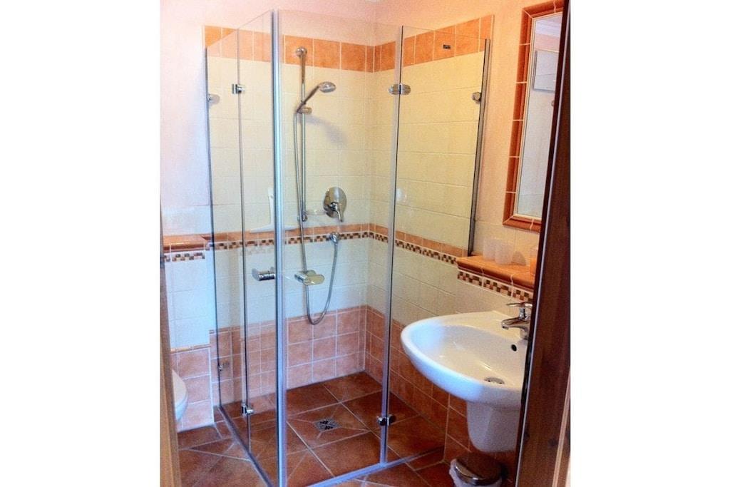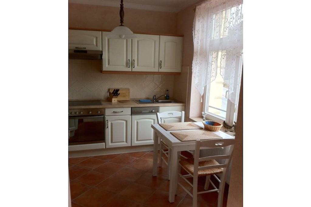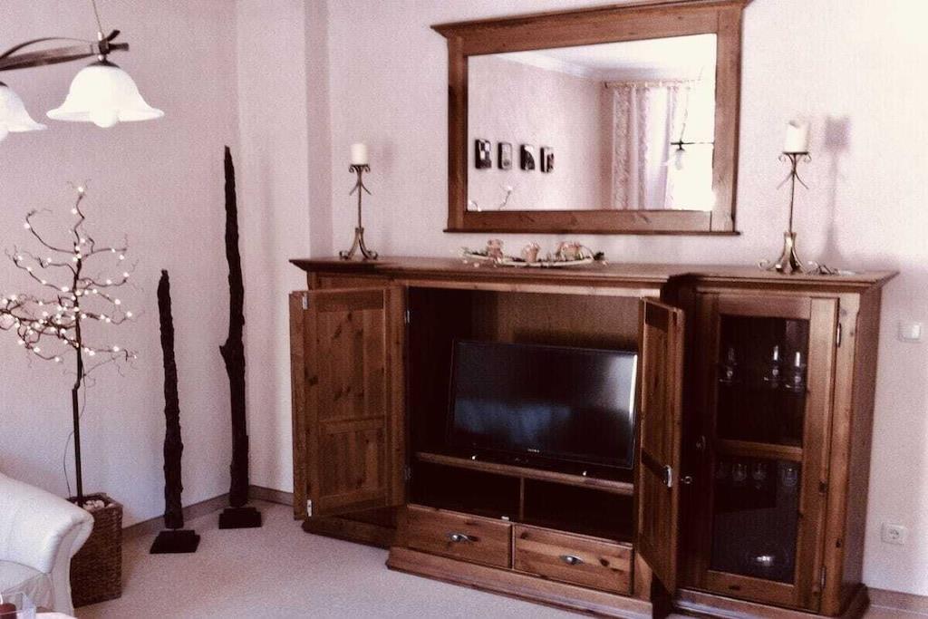 Die Ferienwohnung befindet sich im Obergeschoss und hat ein mediterranes Ambiente. Sie wurde sehr hochwertig und liebevoll eingerichtet und lädt zum wohlfühlen ein. Das Wohnzimmer ist mit einer Ledercouch ausgestattet, die ausziehbar ist. Als eine kleine Besonderheit ist der Wandkamin anzusehen, der auch bei nicht so schönem Wetter eine gemütliche Atmosphäre schafft. Die Küche ist ein separater Raum mit einem großen Fenster. Die Küchenausstattung ist im Landhausstil ausgerichtet und mit einer Cerankochfeld u. Backofen ausgestattet. Das Bad hat eine Vollglasduschkabine die ebenerdig aufgestellt ist. Im Schlafzimmer befindet sich ein Doppelbett mit zwei Matratzen a 90x200.