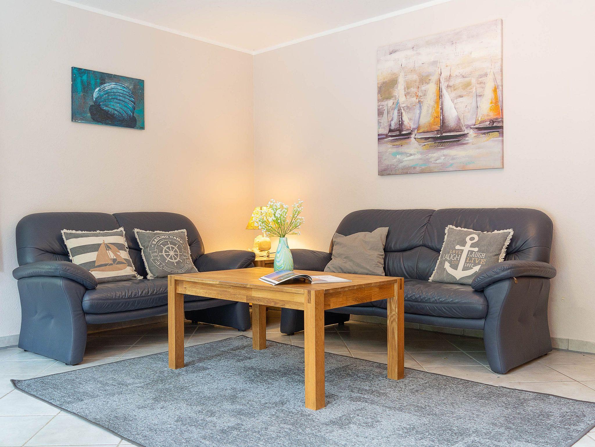 Der großzügige Wohnbereich der Ferienwohnung ist für Sie mit einer gemütlichen Couchgarnitur, einem 42 Zoll SmartTV, einem DVD-Player sowie einer Musikanlage mit CD-Player eingerichet. Als Sichtschutz bzw. zum Verdunkeln sind im Wohnbereich Vorhänge und Plissees an den Fenstern angebracht.