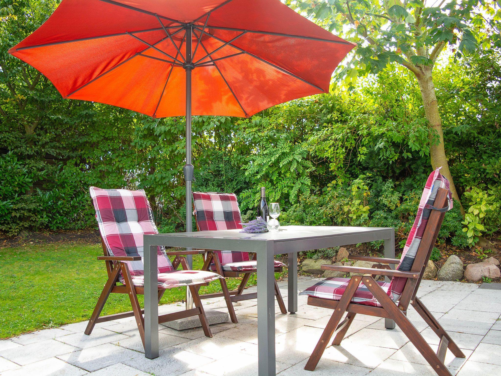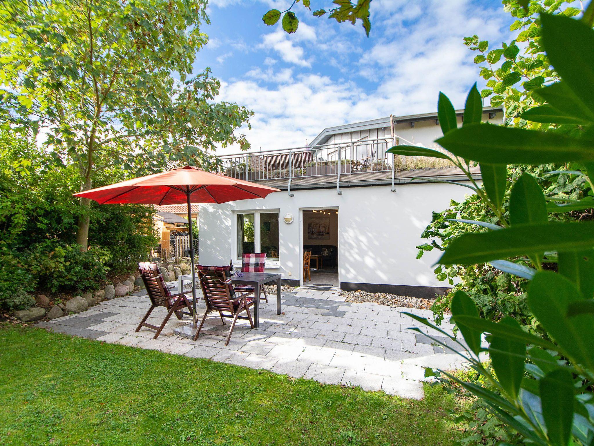 Vom Wohnbereich betreten Sie die große möblierte Terrasse mit Gartenanteil, die nach Osten ausgerichtet ist. Hier können Sie Ihr Frühstück genießen, Sonne tanken, relaxen und den Abend nach einem schönen Tag am Meer ausklingen lassen.